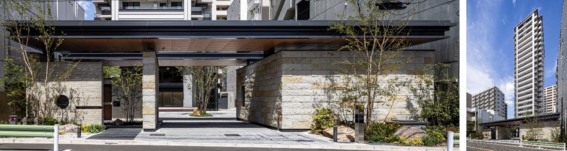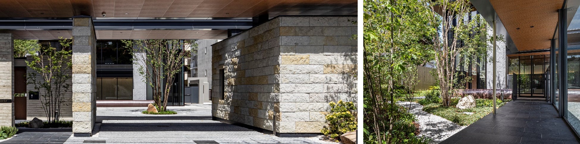 マンションのリノベーションで高層にする際にセットバックし、配達車等が中に入って移動できる前庭とし、敷地計画として提案性が高い。門構えに芦野石(あしのいし)を取り入れ、シンボリックな樹木も気持ちが良く住宅街としての品格を高める効果を感じさせる。エントランスから見える左官壁に敷地の土も取り入れたり、高層部の外壁にはさりげなく濃淡を活かしたりして、新しさと日本の伝統を合体させている。周辺の今後への提案を感じさせる。