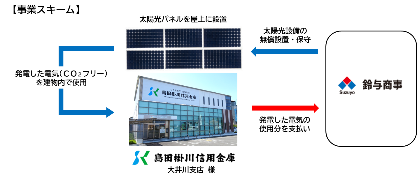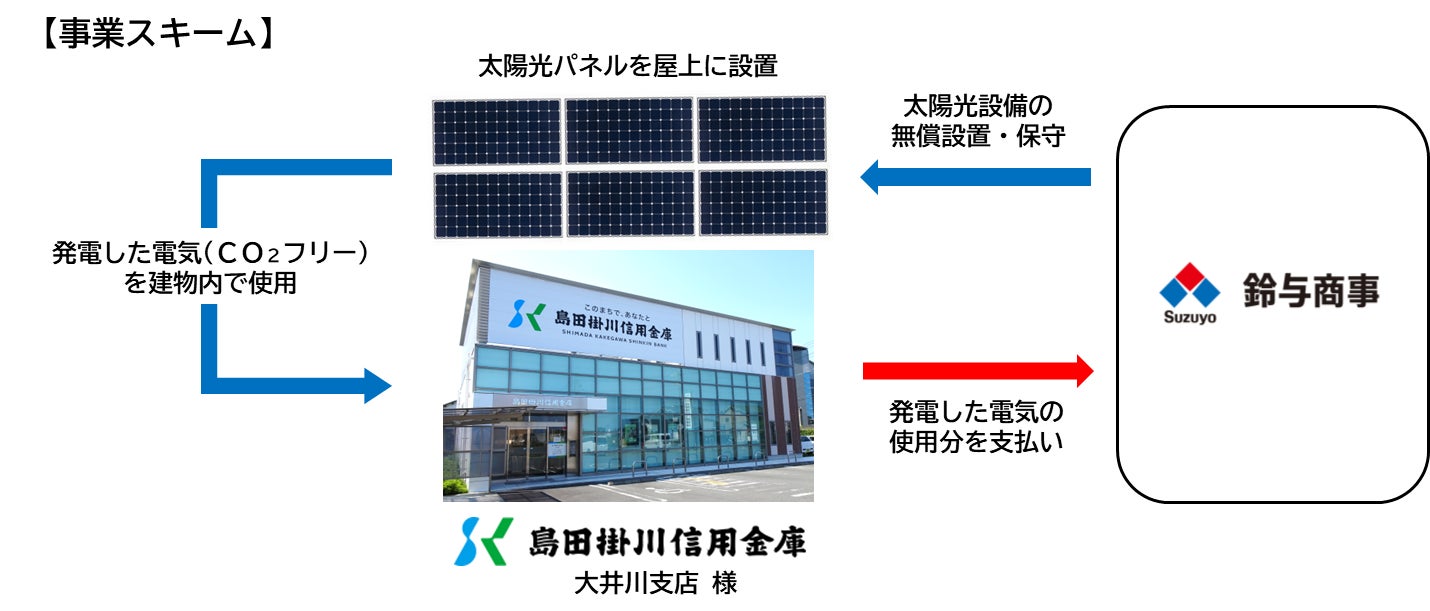 この取り組みでは、鈴与商事が島田掛川信金大井川支店に無償で太陽光発電設備を設置し、発電した電気を同支店建物内で自家消費することで、再生可能エネルギーの利用促進およびCO2の削減に寄与します。