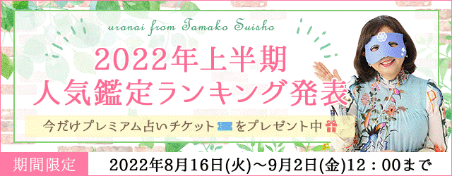 この度、月額公式サイト『水晶玉子 陰陽艶花占』にて『2022年上半期人気鑑定ランキング』を公開しております。ランキングの占いをご購入の方に抽選でプレミアム占いチケットをプレゼントいたします。この機会をどうぞお見逃しなく!