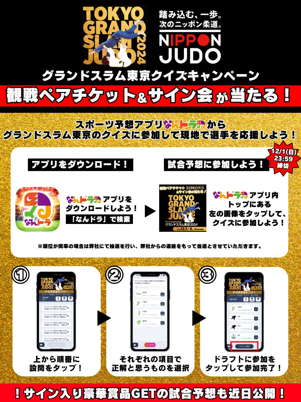 イノベーションの力で新たなスポーツ・エンターテインメントを創造し、まだ見ぬ感動と熱狂を提供するアプリ「なんドラ」を運営する株式会社なんでもドラフト(本社:東京渋谷区、代表:森井啓允)は、公益財団法人全日本柔道連盟と提携し、12月7日(土)・8日(日)に東京体育館で開催される、柔道『パーク24presentsグランドスラム東京2024』にて、今年も活躍選手予想企画を実施します。その開催に先駆けて、11月26日(火)から12月1日(日)までの期間で、パーク24presentsグランドスラム東京2024 ペア招待券や会場でのサイン会参加券が当たるクイズチャレンジ企画を開催します。