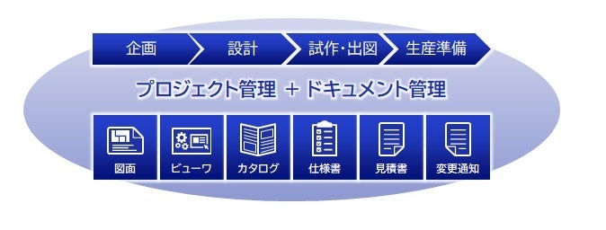 約1,000社の導入実績があるPLMシステム(注)のプロジェクト管理とドキュメント管理をワンストップで提供します。これにより、商品開発のプロジェクト進捗と最新ドキュメントの全社共有を実現します。