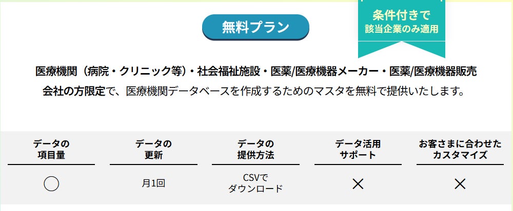 ※無料プランは、医療機関(病院・クリニック等)・社会福祉施設・医薬/医療機器メーカー・医薬/医療機器販売 会社の方限定で提供しております。