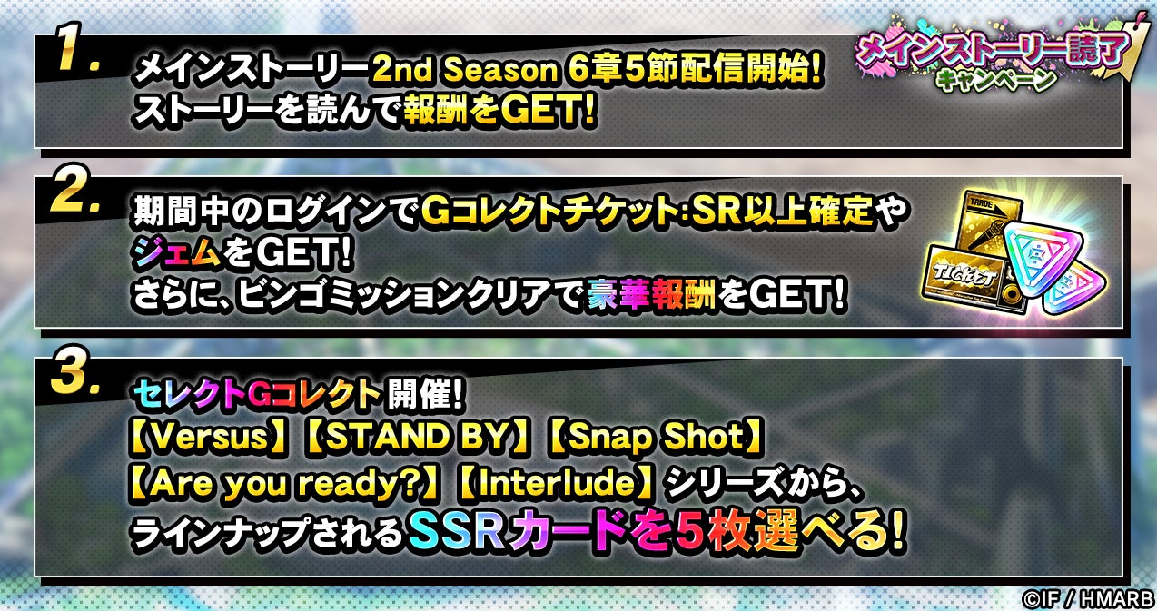 期間中、特定シリーズのSSRカードを選んでラインナップに追加できるセレクトGコレクトや、ビンゴミッションやログインボーナスなどを開催いたします。