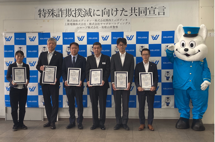 株式会社ヤマダホールディングス(本社:群馬県高崎市、代表取締役会長 兼 社長 CEO:山田 昇、以下、ヤマダホールディングス*)は、和歌山県警察による特殊詐欺の被害防止に向けた取り組みに賛同し、防犯機能付き電話機を扱う家電販売会社として「特殊詐欺撲滅に向けた共同宣言式」に参列しました。
