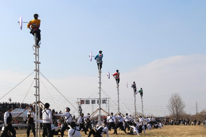 この出初め式は、加古川市消防本部と消防団が主催する年に一度の行事です。当日は、消防職・団員約1,000名による迫力ある分列行進や、消防団員による伝統のはしご乗り演技、中央・東消防署救助隊による消防アトラクション、そして一斉放水などが披露されます。加古川に向けて放水する模様は圧巻で、他では見られない加古川市ならではの式典です。