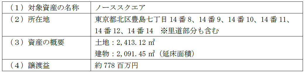 ※譲渡価額、帳簿価額につきましては、譲渡先の意向により、開示は控えさせていただきますが、譲渡価額は、複数の不動産関係会社等、第三者の助言を得て不動産の価値を精査した市場価格を反映した適正な価額となっております。なお、譲渡益につきましては譲渡価額から帳簿価額を控除した概算値となっております。