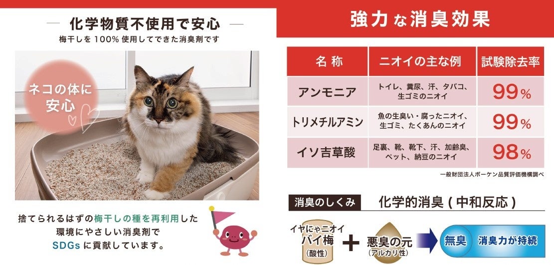 「イヤにゃニオイバイ梅!」は、猫砂やシートにふりかけるだけでニオイ成分に直接作用し、強力な消臭効果を発揮する新発想の消臭剤です。猫の尿に含まれるアンモニアや魚の生臭いニオイの原因となるトリメチルアミンを99%、汗のニオイ成分であるイソ吉草酸を98%消臭する効果が確認されています。