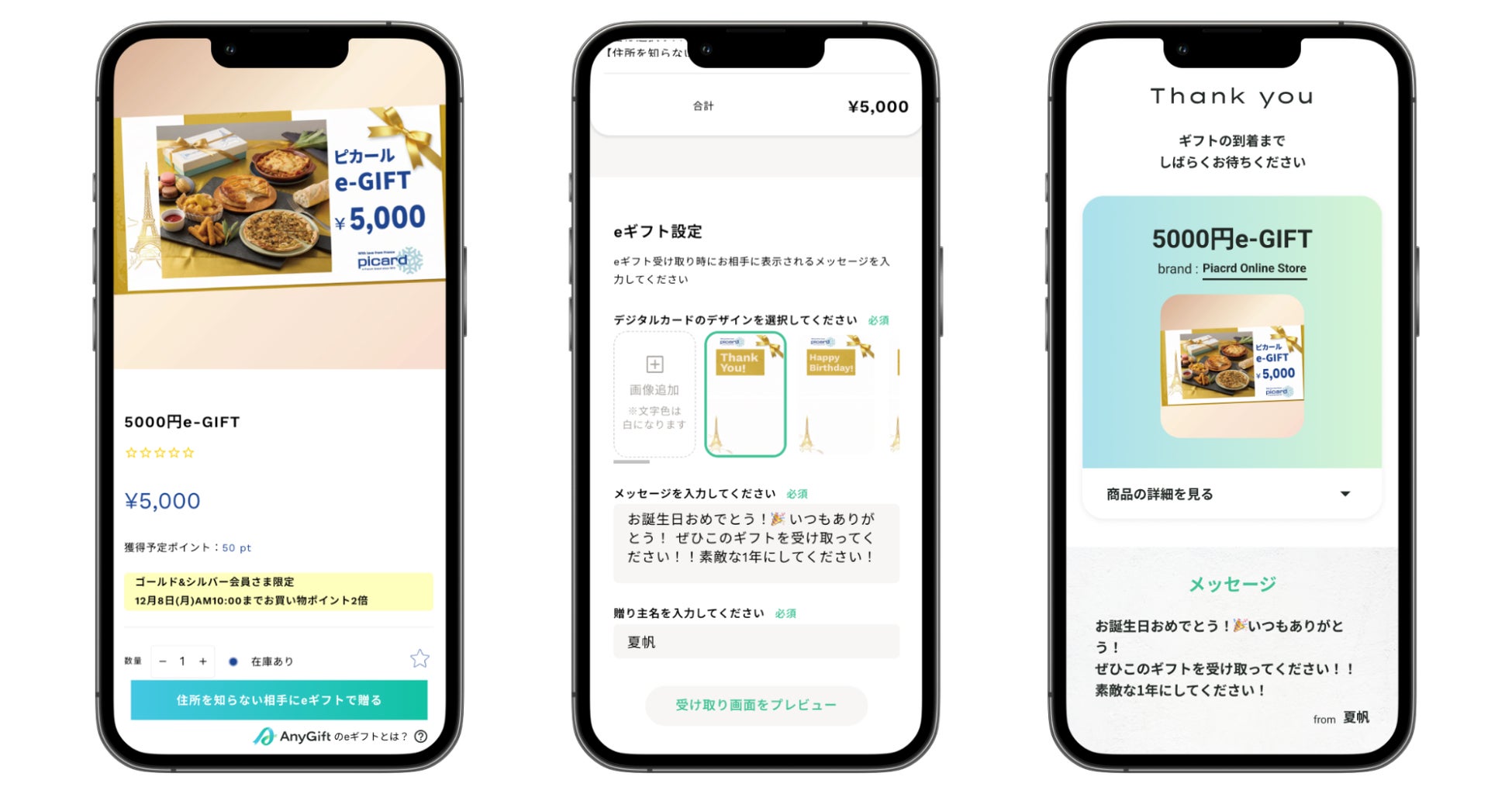 AnyGiftの導入により、Picard Online Shopでのお支払いに利用できる『ソーシャルギフトカード』が贈れるようになりました。