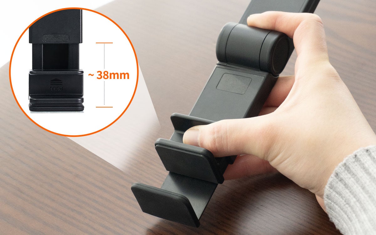 マウントベースは、スプリングを内蔵したクランプ式。最大38mmまでの板・棒状のものに、工具なしで簡単に取り付け可能です。