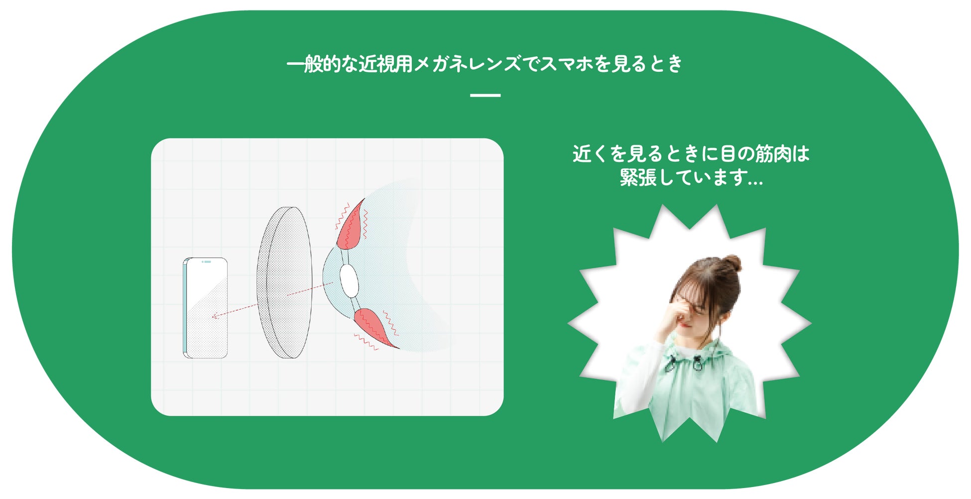 このような背景を受けて開発された『MELLNESS』は、毛様体筋の緊張を和らげるストレッチゾーンを配置した設計のレンズです。『MELLNESS』を掛けて遠くや近くを見ることで、目の筋肉がストレッチしているような状態になり、目にかかる負担を軽減することができます。