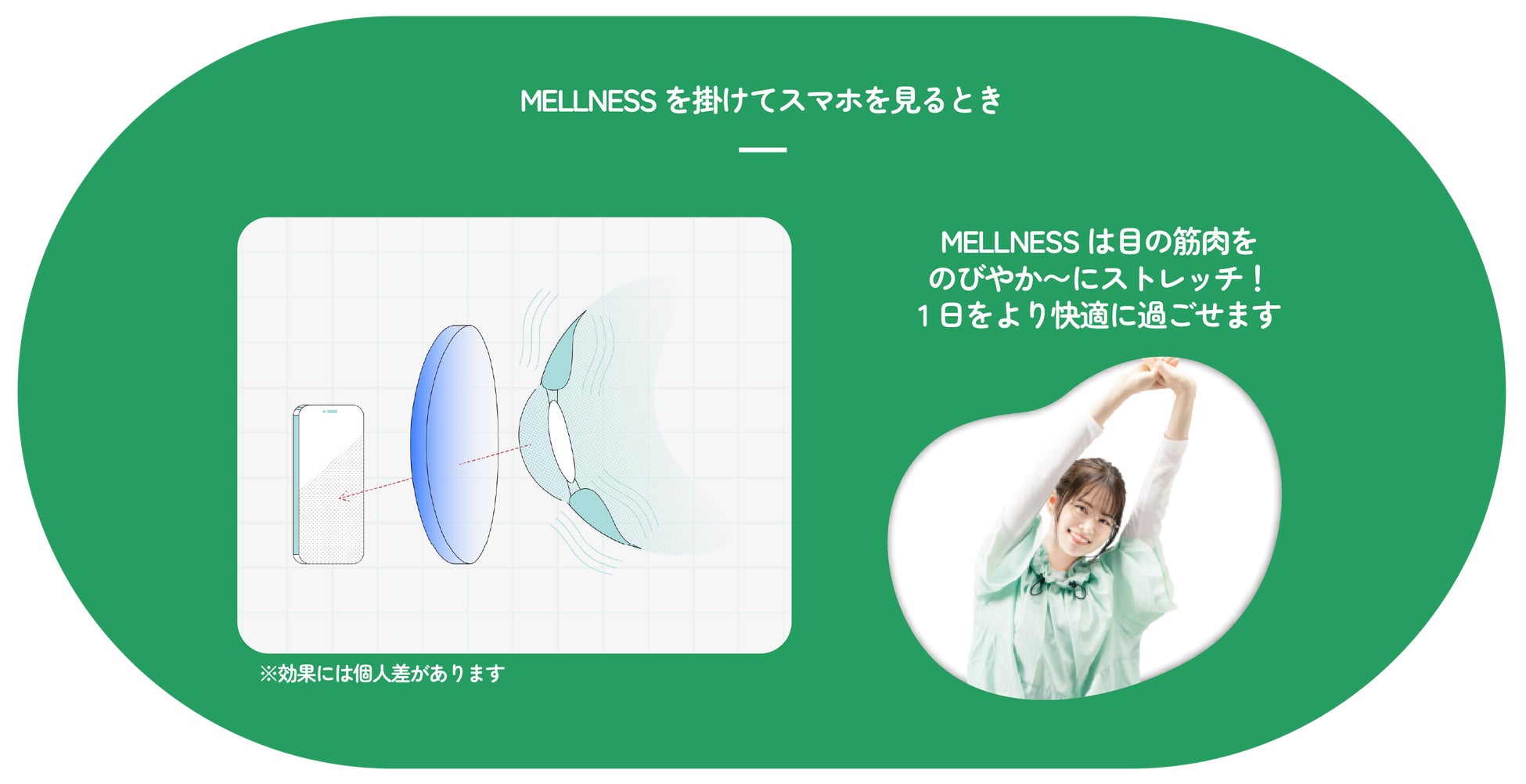 『MELLNESS』は、近くを見る機会が多く目が緊張しやすい現代生活の中で「メガネで『見る』だけじゃなく『目のストレッチ』もしてもらおう!」そんな思いで開発した眼鏡市場オリジナルのメガネレンズです。