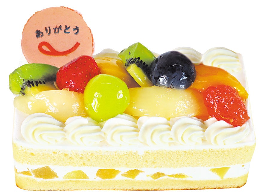 スポンジで桃のシロップ漬けとシャンテリークリームをサンドし、上面には、旬のシャインマスカットや巨峰のほか、色とりどりのフルーツをたっぷり飾りました。キラキラと輝くフルーツが華やかなバトンケーキです。「ありがとう」入りマカロン皮付きですので、敬老の日に家族で楽しむのにもぴったりです。