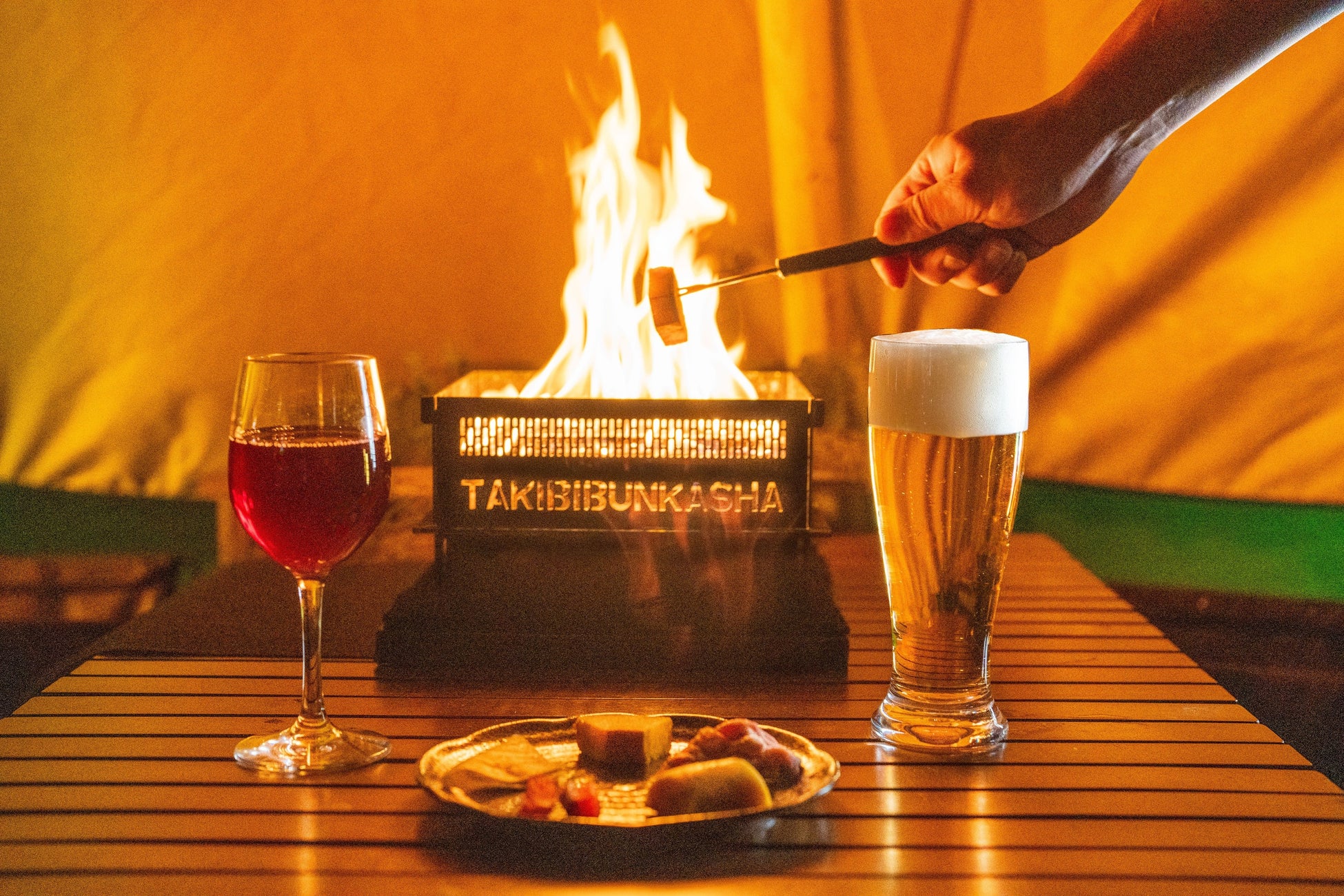テント内ではビールやハイボールの他オプションでホットワインやウイスキーなどTAKIBIフードに合うドリンクを用意し、焚き火の灯りとともにくつろぎの時間を体験いただけます。