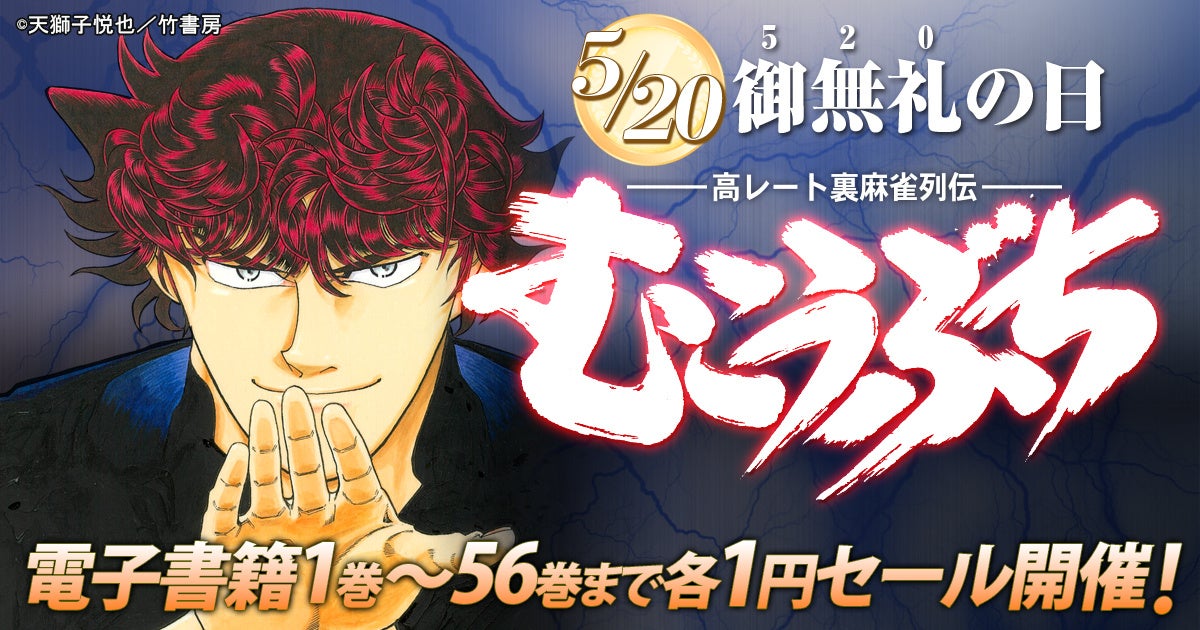 株式会社竹書房(本社:東京都千代田区、代表取締役社長:宮田純孝)が刊行する雑誌、近代麻雀(毎月1日発売)にて連載中のコミック『むこうぶち』(著:天獅子悦也)にて、作中の名台詞「御無礼(520)」となる5月20日(火)、主要電子書籍ストアにてバブル時代編全56巻分の24時間限定1円セール、57~62巻まで50%OFFを実施いたします。
