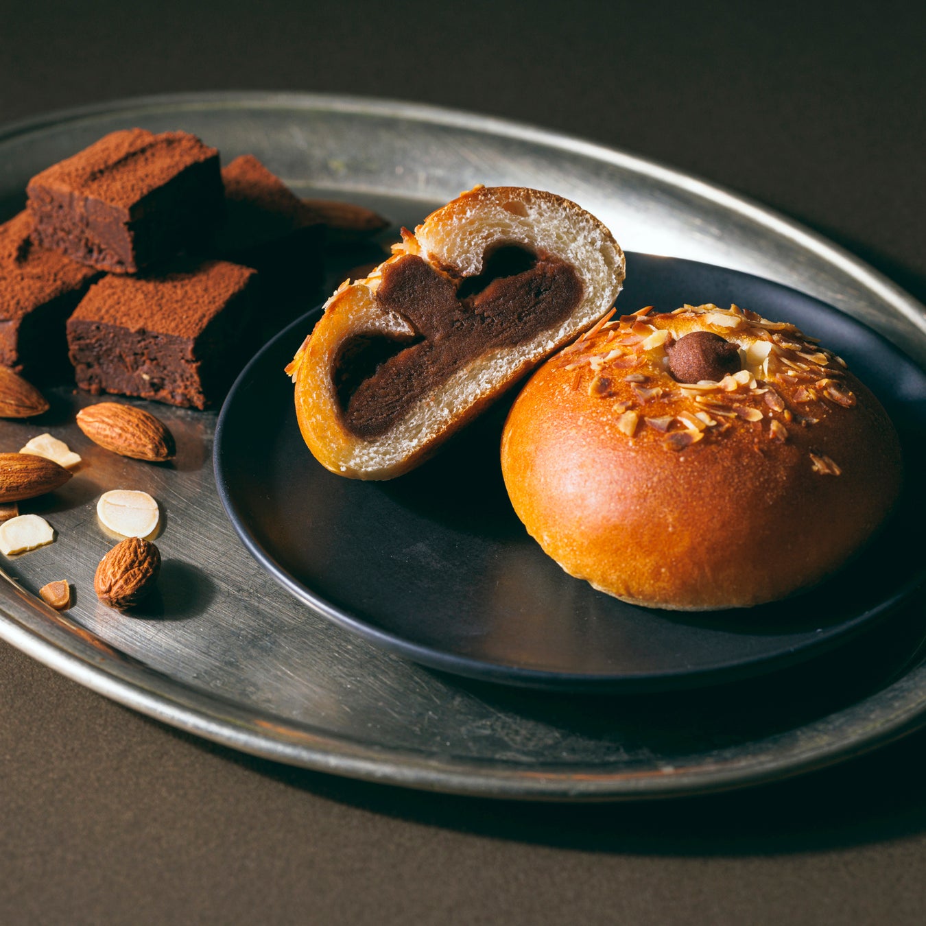 白あんにチョコレートとクリームを合わせ、風味豊かで口溶けのよい生チョコのようななめらかな食感に仕上げました。食感のアクセントにチョコと相性の良いアーモンドを表面にトッピングしました。