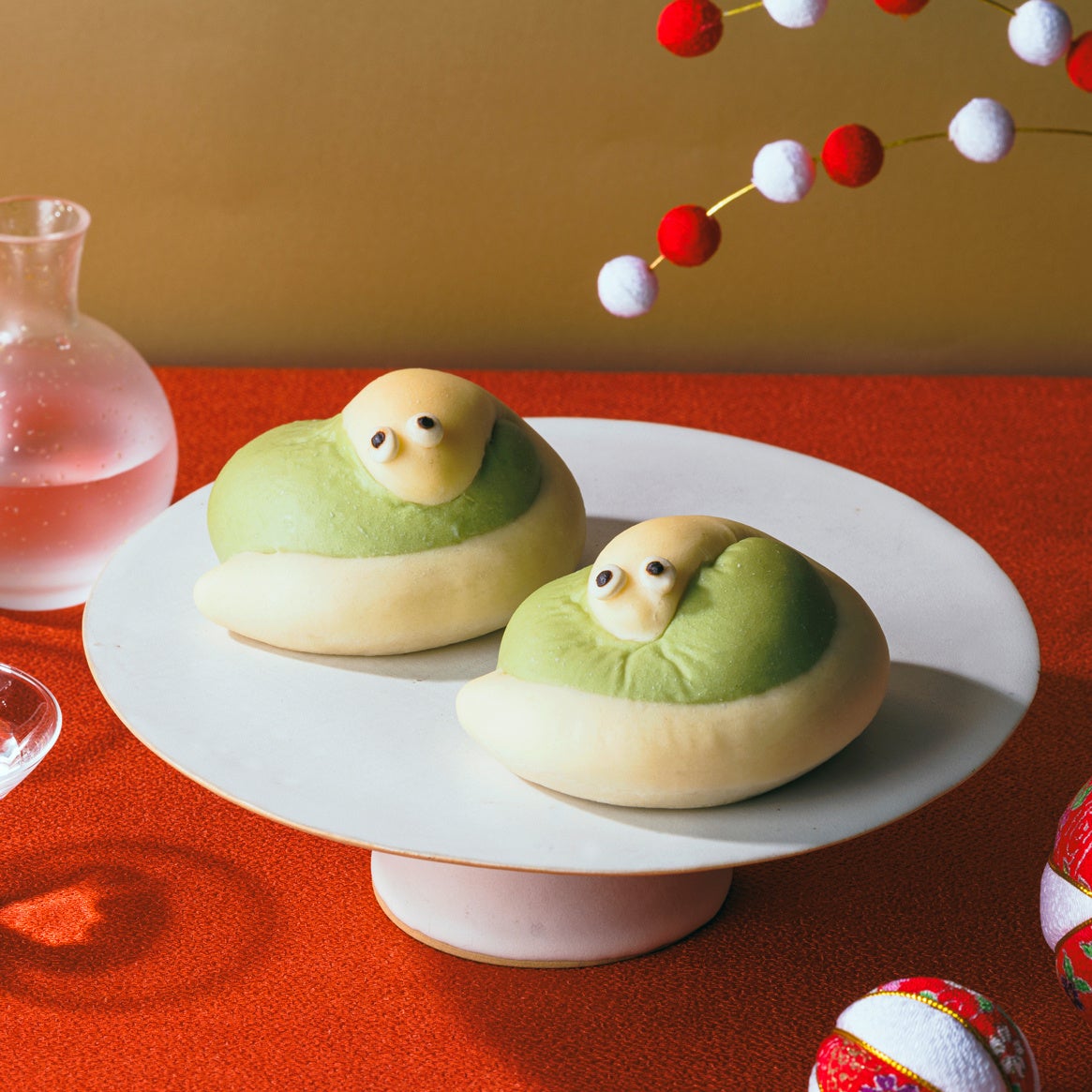 カスタークリームを包んだメロン風味の生地に、ほんのり甘い練乳風味の白ヘビをイメージした生地を合わせました。くりっとした目元がかわいらしい干支パンです。