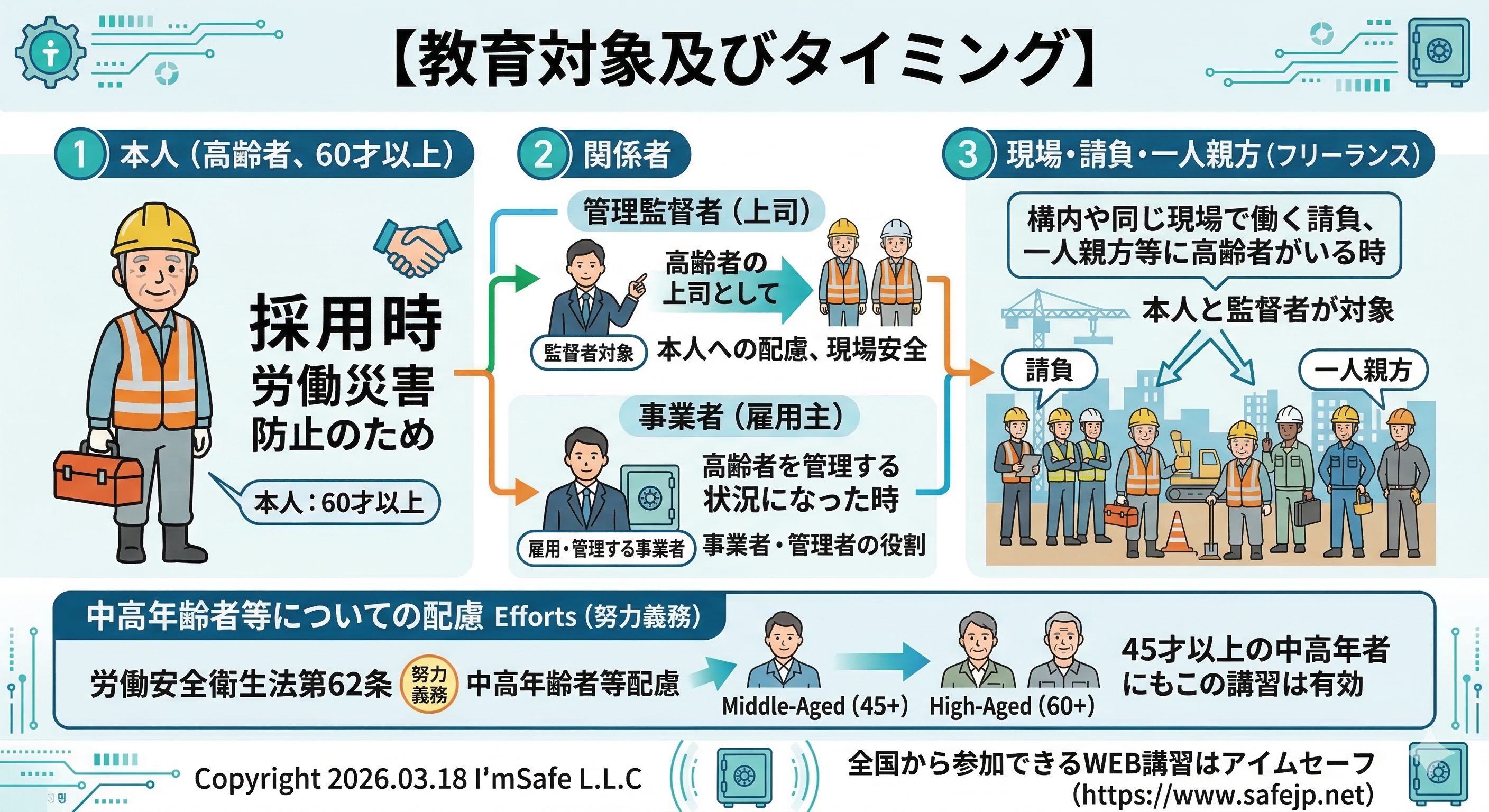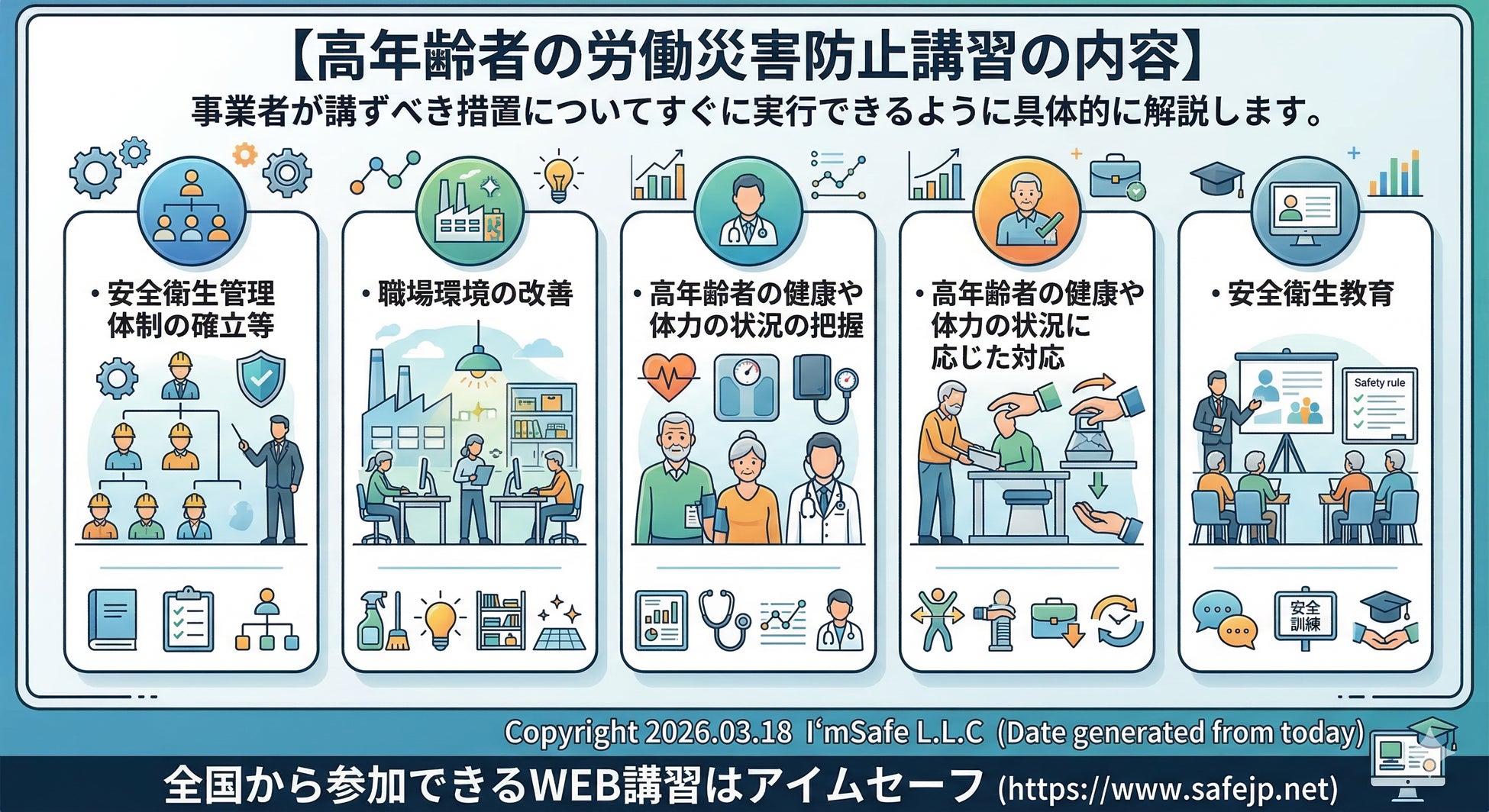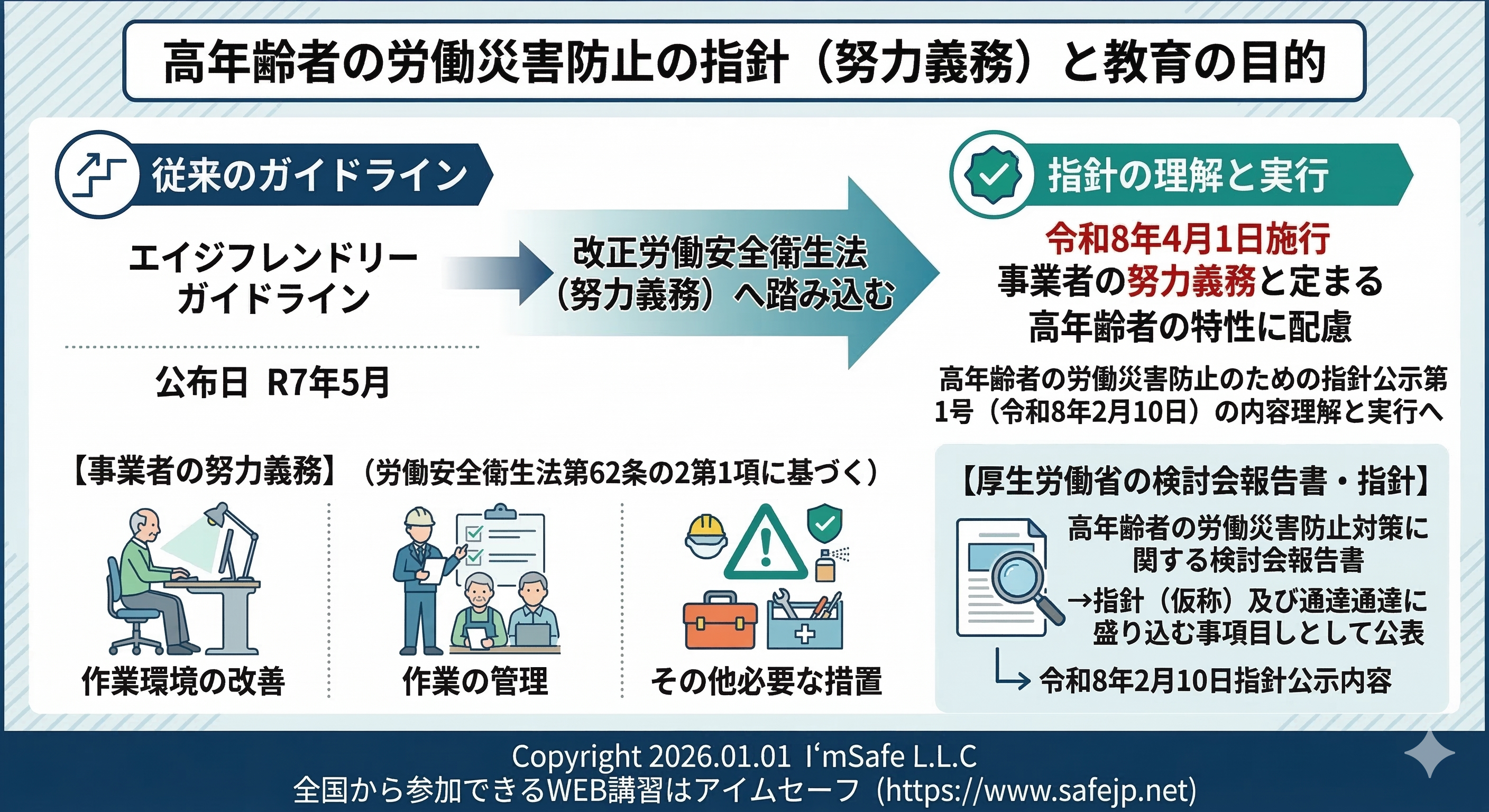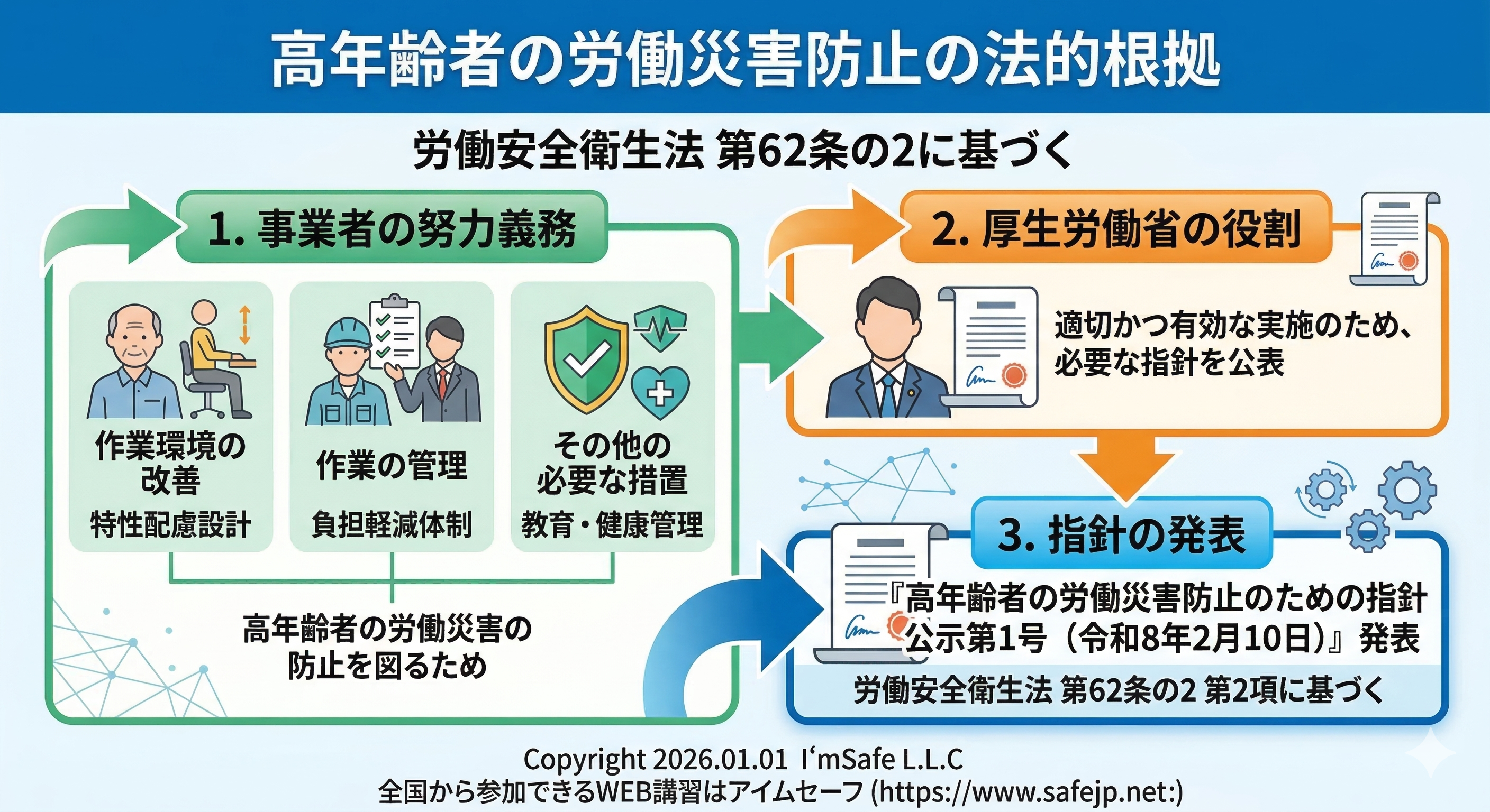 アイムセーフの高年齢者の労災防止講習は、労働安全衛生法第62条の2の事業者の高年齢者の労働災害防止のための措置にもとづき、厚労省の高年齢者の労災防止のための指針(令和8年2月10日)に示された事業者が積極的に取り組む必要があるとされる5つの事項について講習を実施しています。