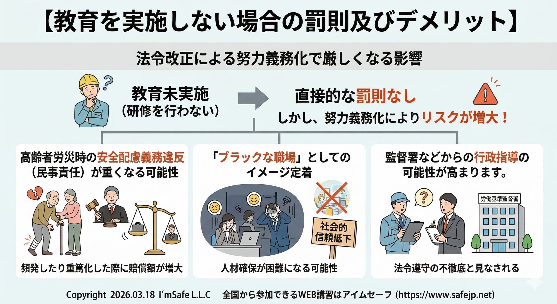高齢者の労災が頻発したり重篤化した場合の、安全配慮義務違反(民事責任)が重くなる可能性、ブラックな職場としてのイメージ、監督署などからの行政指導の可能性が高まります。