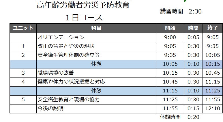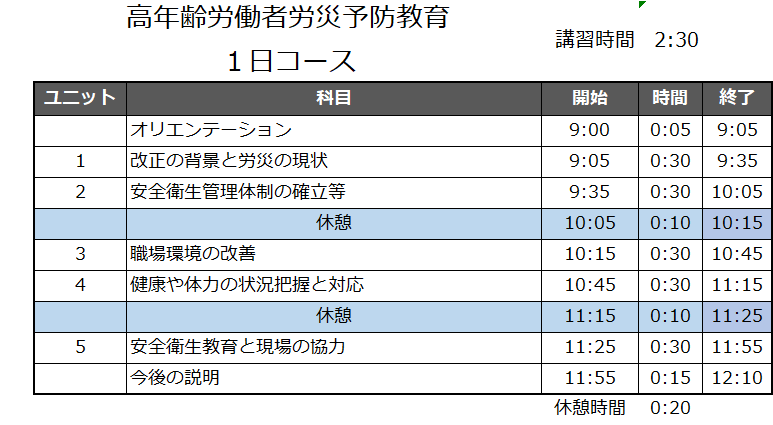 また、労働安全衛生法第62条に『中高年齢者等についての配慮の努力義務』がありますので、45才以上の中高年者にもこの講習は有効です。