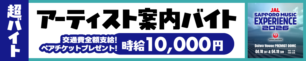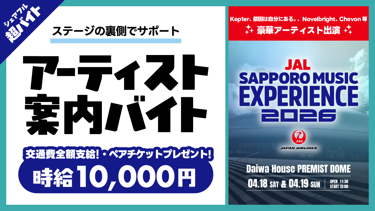 「はたらいて、笑おう。」をビジョンに掲げるパーソルグループのスキマバイトアプリ『シェアフル』やSaaSシフト管理サービス『シェアフルシフト』、就業実績を活用した人材紹介サービス『シェアフルエージェント』などを提供するシェアフル株式会社(本社:東京都港区、代表取締役社長:横井 聡)は、2026年4月18日(土)、19日(日)に札幌市 大和ハウス プレミストドームで開催される音楽フェス『JAL SAPPORO MUSIC EXPERIENCE 2026』にて、ステージ裏でのアーティストの案内やドリンクのお渡しをする「アーティスト案内バイト」を『シェアフル』超バイトで募集します。