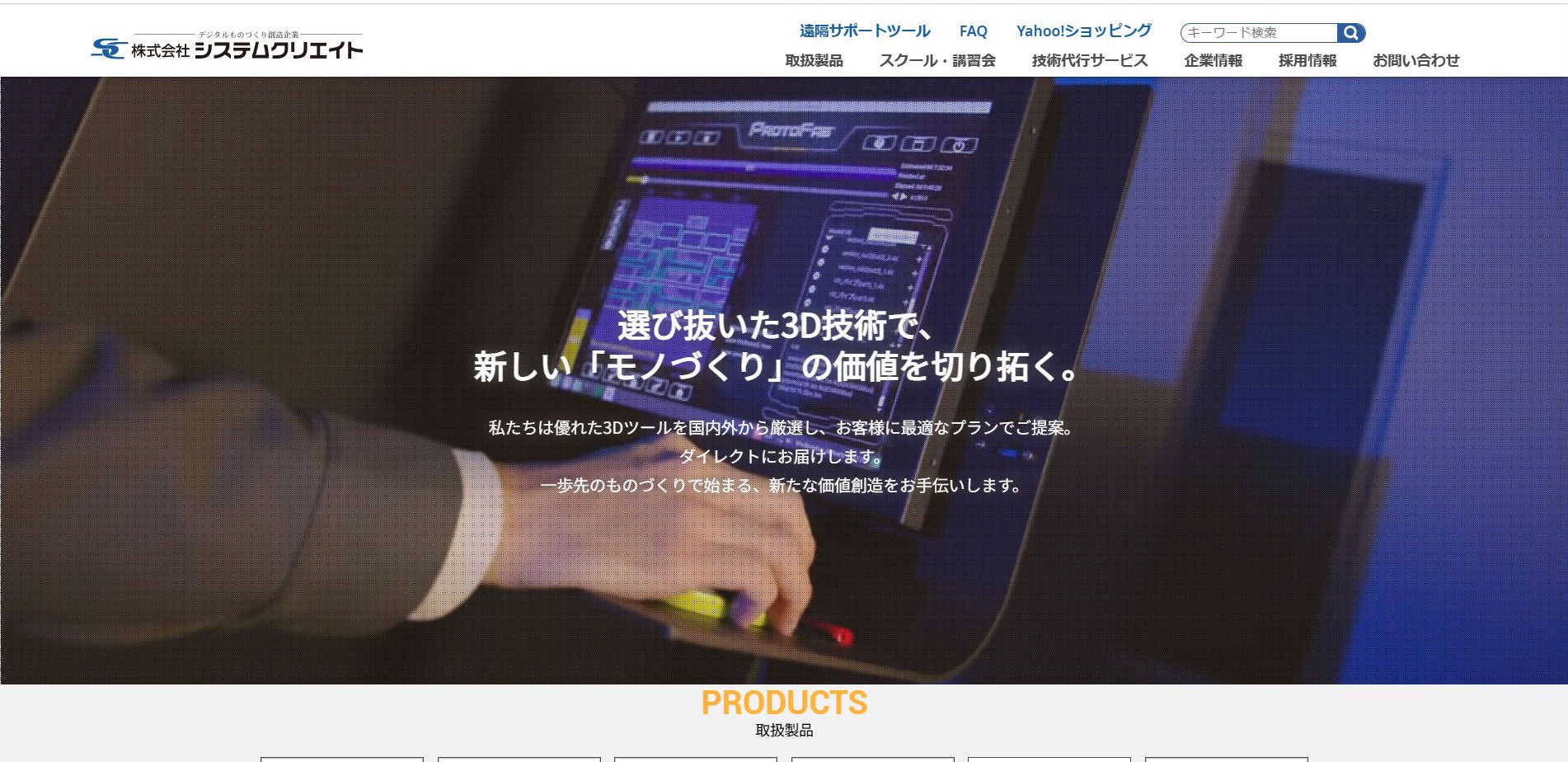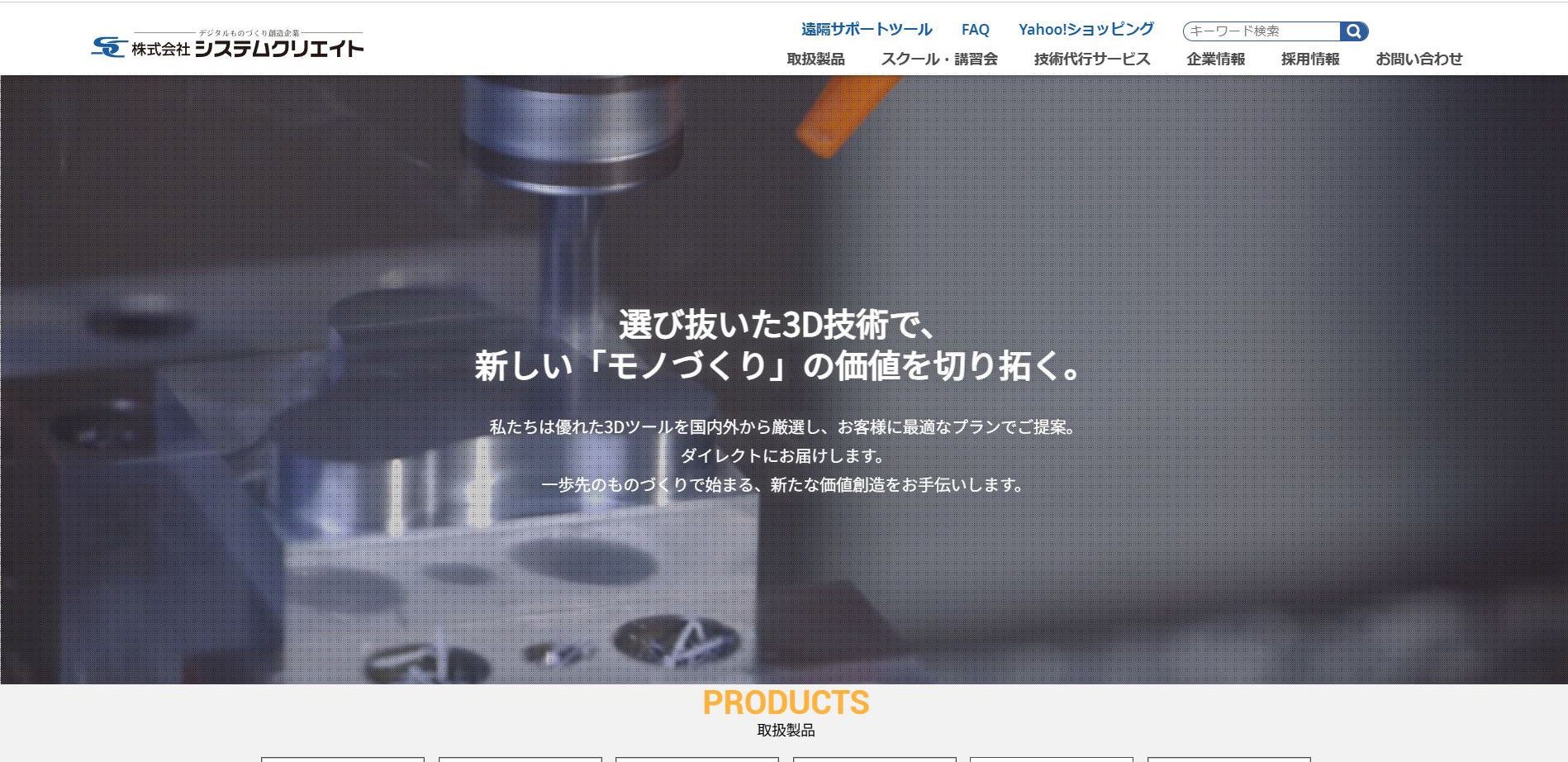 システムクリエイトは、ものづくり企業向けのソリューションプロバイダーとして、3Dプリンターや3Dスキャナーなどの3Dツール、工作機械の販売からCAD/CAMなどのソフトウェア、技術サポート、トレーニングまで幅広く提供しています。また、加工・造形の知識を活かして、受託業務の依頼もお受けしています。