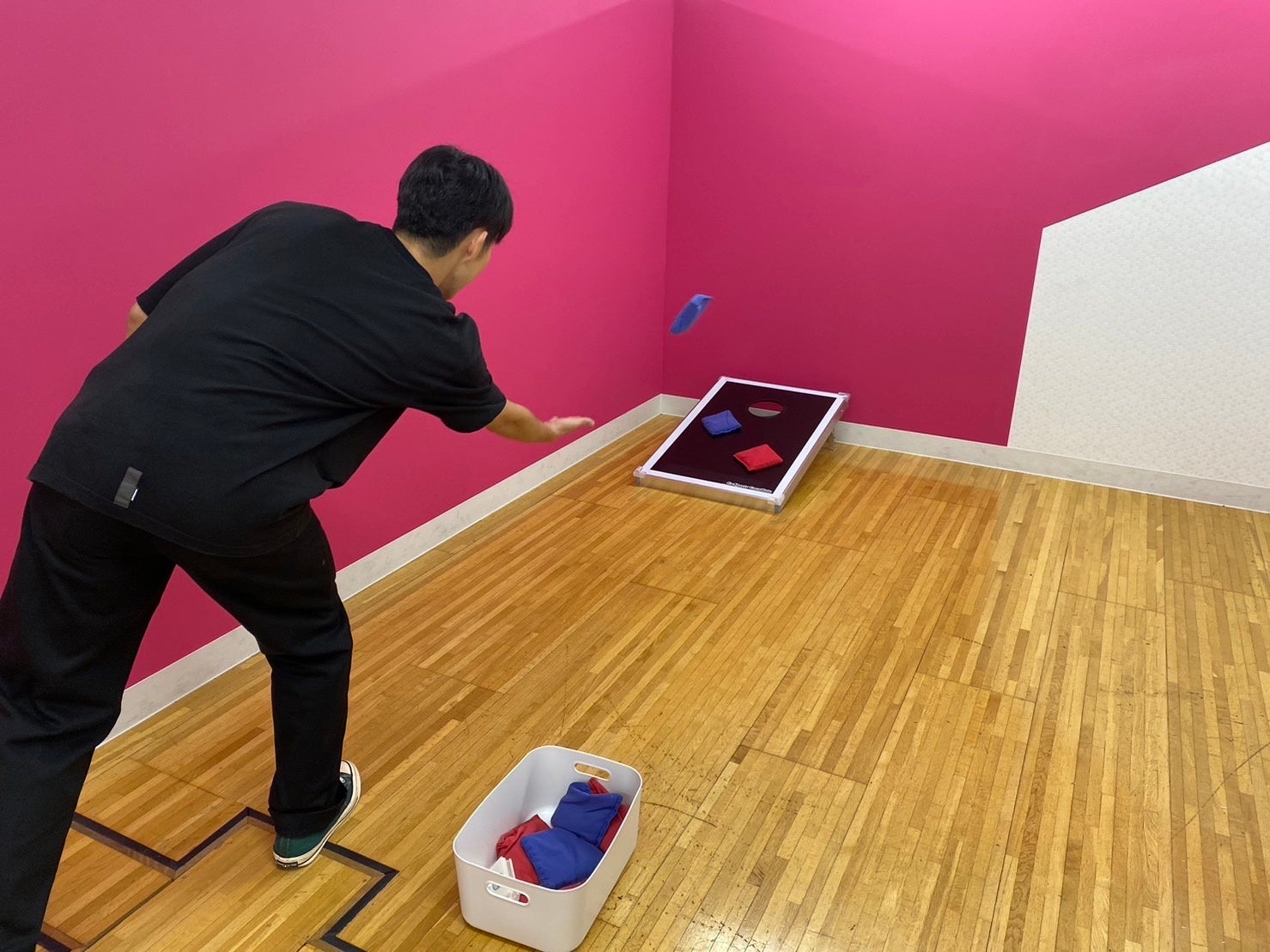 色分けされたビーンバッグをボードの穴に投げて得点を競う!