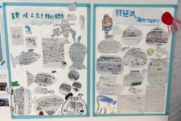 みんなが作成したレポートで「琵琶湖と海のつながり」「環境と生き物の関係」の2枚の壁新聞を作成しました。海なし県である滋賀県に住む私たちが琵琶湖だけでなく海を守るためにできることは何か、琵琶湖や海で生活する生き物を守るために私たちにできることは何かなど、それぞれが考え発表しました。