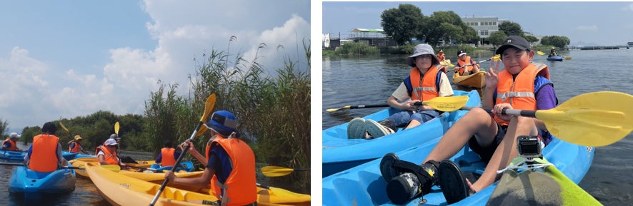 最終日は滋賀県の「O'PAL」で琵琶湖の環境と生物の関係について学習しました。ヨシには生き物のすみか、水を綺麗にするといった役割があるが、冬になると枯れてしまい水が汚れる原因となるので、枯れる前に刈り取る必要があること、刈り取ったヨシはすだれやノート、食べ物として再利用できることを学びました。学習した後はカヌーに乗って実際にヨシ帯の見学へ!初めてのカヌーに緊張している子もいましたが、どんどん上達し、楽しそうに琵琶湖を探検し、琵琶湖の豊かさを体感しました。