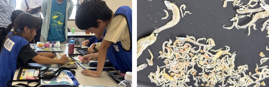 2日目の午後は、ちりめんじゃこに紛れた生き物を見つけ出す「チリメンモンスター」探しを行いました。ちりめんじゃこには「カタクチイワシ」の稚魚が使われますが、そのほかにも、マイワシ、タコ、エビ、カニ、フグなどの沢山の生き物が見つかりました。ちりめんじゃこの中にこんなに沢山の魚が紛れていることを知り、子どもたちは海の中で生活する生き物がたくさんいるということを実感することができました。みつけたチリメンモンスターはカードに貼り付け「チリモンカード」を作成し、帰り道でもどんなモンスターを見つけたか話題になるくらいみんなとても気に入っていました。