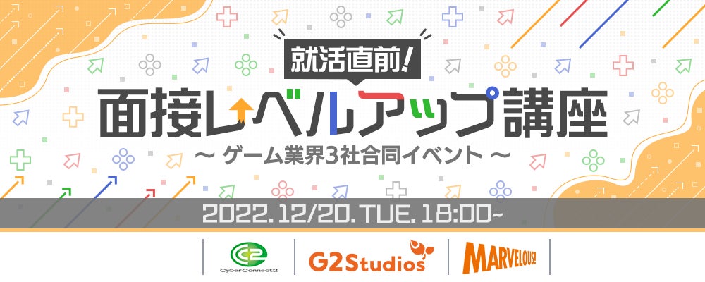 今回のイベントは、G2 Studios、サイバーコネクトツー、マーベラスの3社による、ゲーム業界を目指す学生向けのイベントです。ゲーム業界についての基本的な情報や、各社の魅力などをお伝えすることで、ゲーム業界への理解を深め、業界・企業分析の一助となる内容をお届けします。また、参加者の皆さんの今後の就職活動に少しでもお役立ていただけるようなイベントになるよう、面接官が見ているポイントやオンラインとオフライン面接の違いなどをお伝えする面接講座も実施いたします。ゲーム業界にご興味のある学生の皆様からのご参加をお待ちしております。
