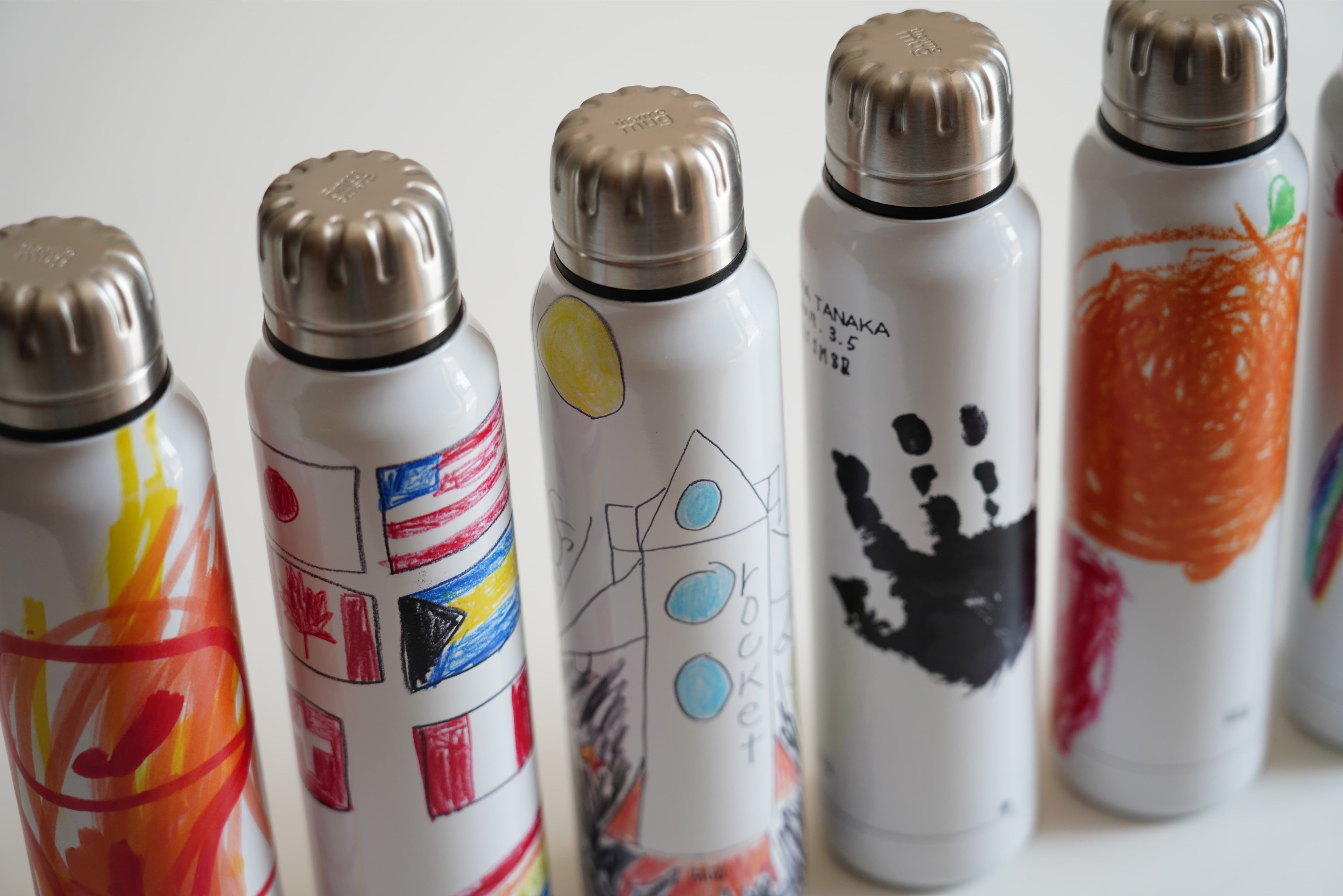 手書きの絵やメッセージがそのままデザインに、自分だけのオリジナルボトルが作れるワークショップ。一枚の専用紙に好きな絵を描くだけ。 thermo mug の代表的な “Umbrella Bottle(アンブレラ ボトル)”は機能性に優れ、持ち運びに最適。思い出づくりとしてだけでなく、プレゼントにもおすすめ。