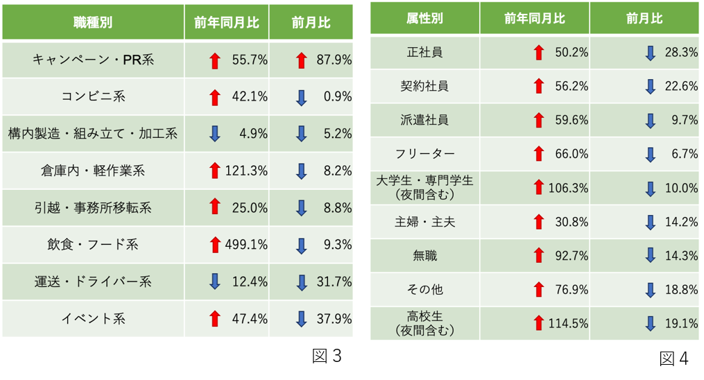 前年同月比で最も増加率が大きかったのは「飲食・フード系」で、+499.1%となっており、ついで「倉庫内・軽作業系」、「キャンペーン・PR系」となっています。
