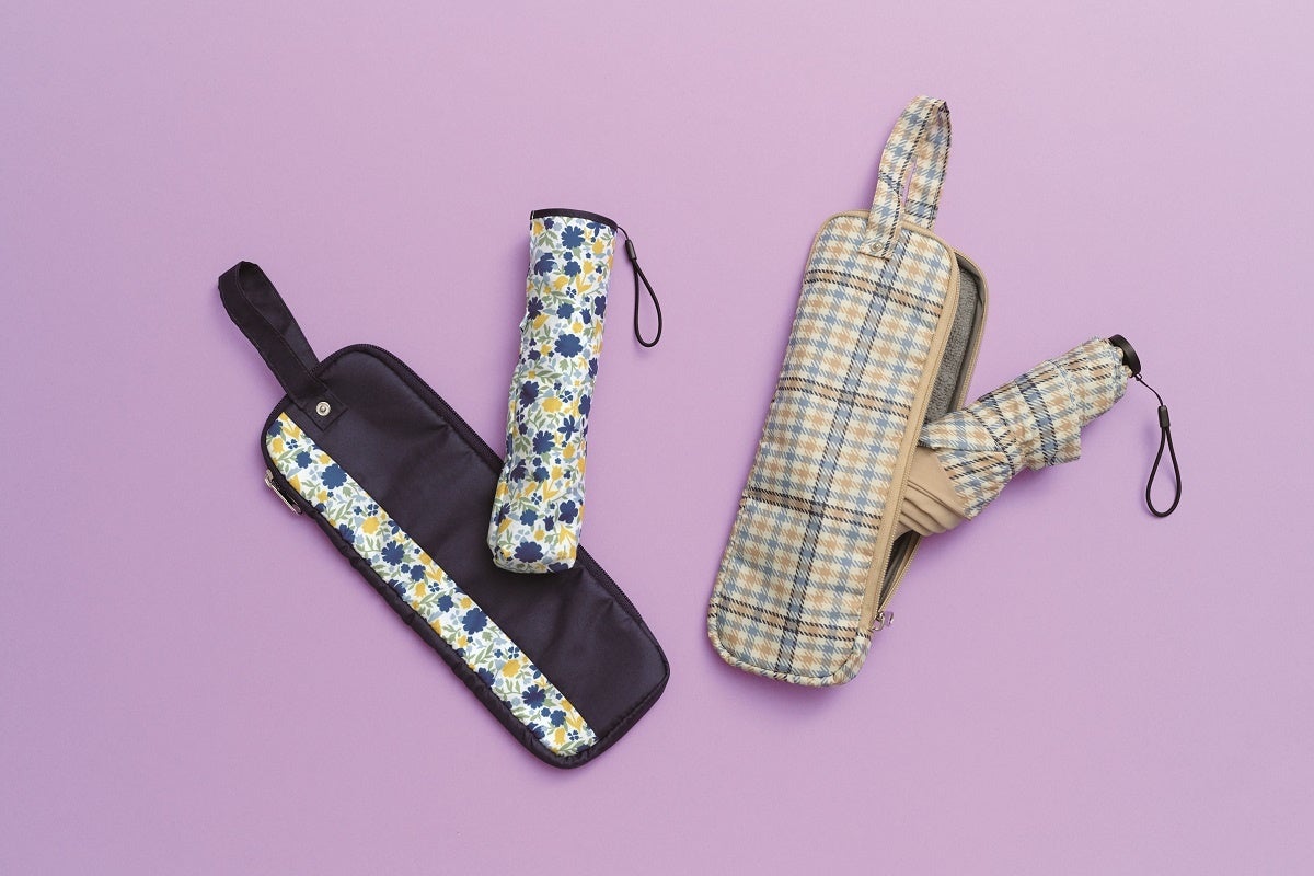 ドロストレインコートの袖とおそろい柄の折りたたみ傘も登場。