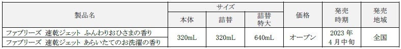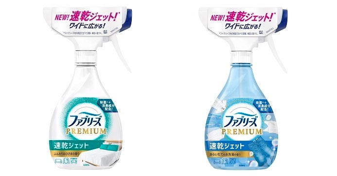 「ファブリーズ 速乾ジェット」は、「ふんわりおひさまの香り」と「あらいたてのお洗濯の香り」の2種類の香りのラインアップで販売いたします。