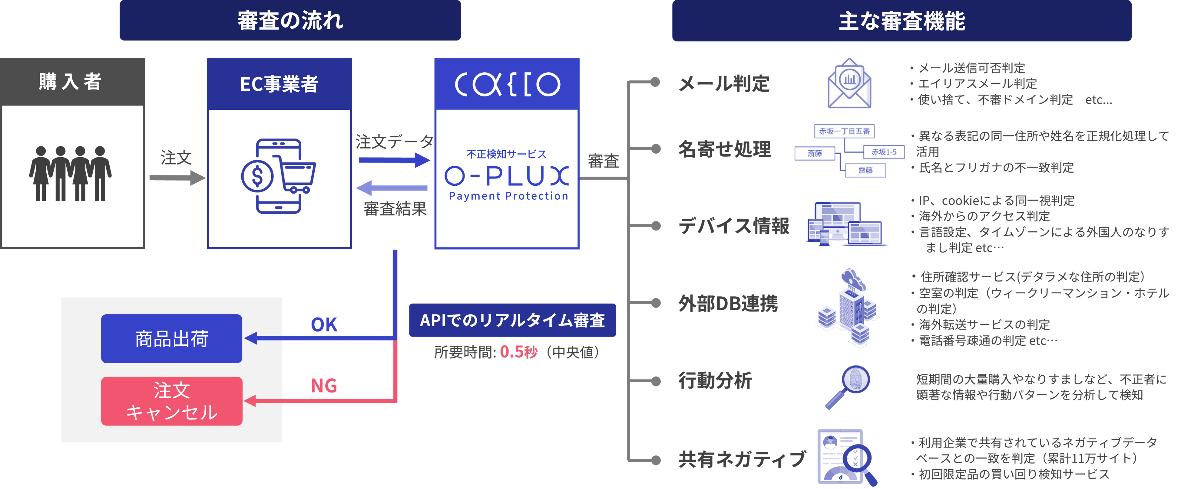 多種多様な共有ネガティブデータ、特許取得の名寄せ技術、ローカライズされた審査ロジックで高い検知精度を実現。