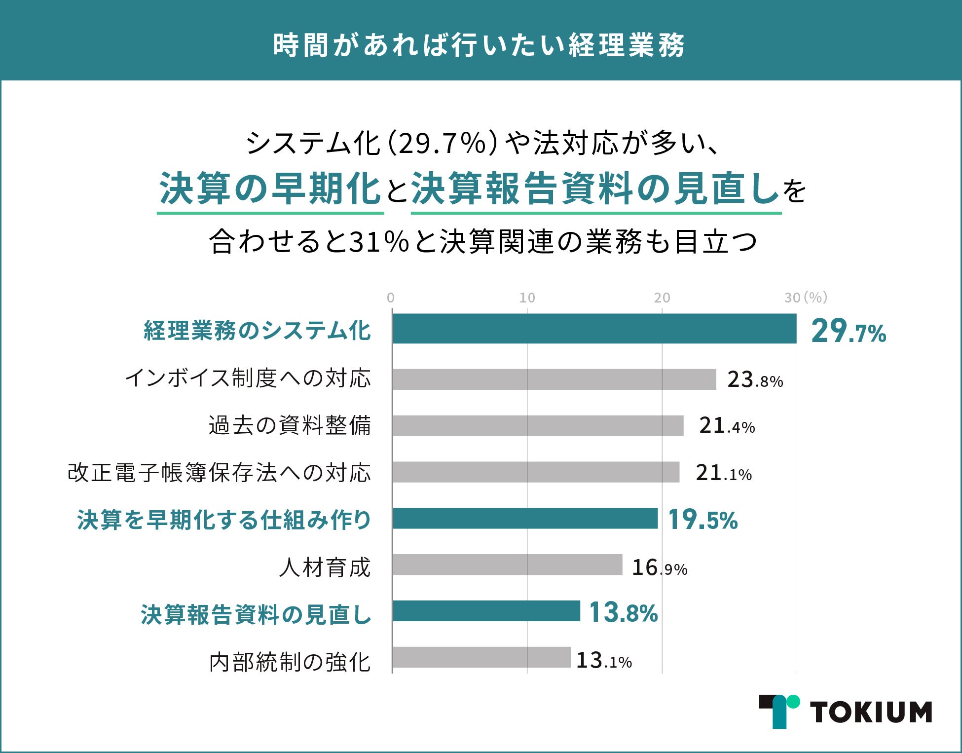 - 時間があれば行いたい業務には、経理業務のシステム化や決算業務の効率化を望む声が