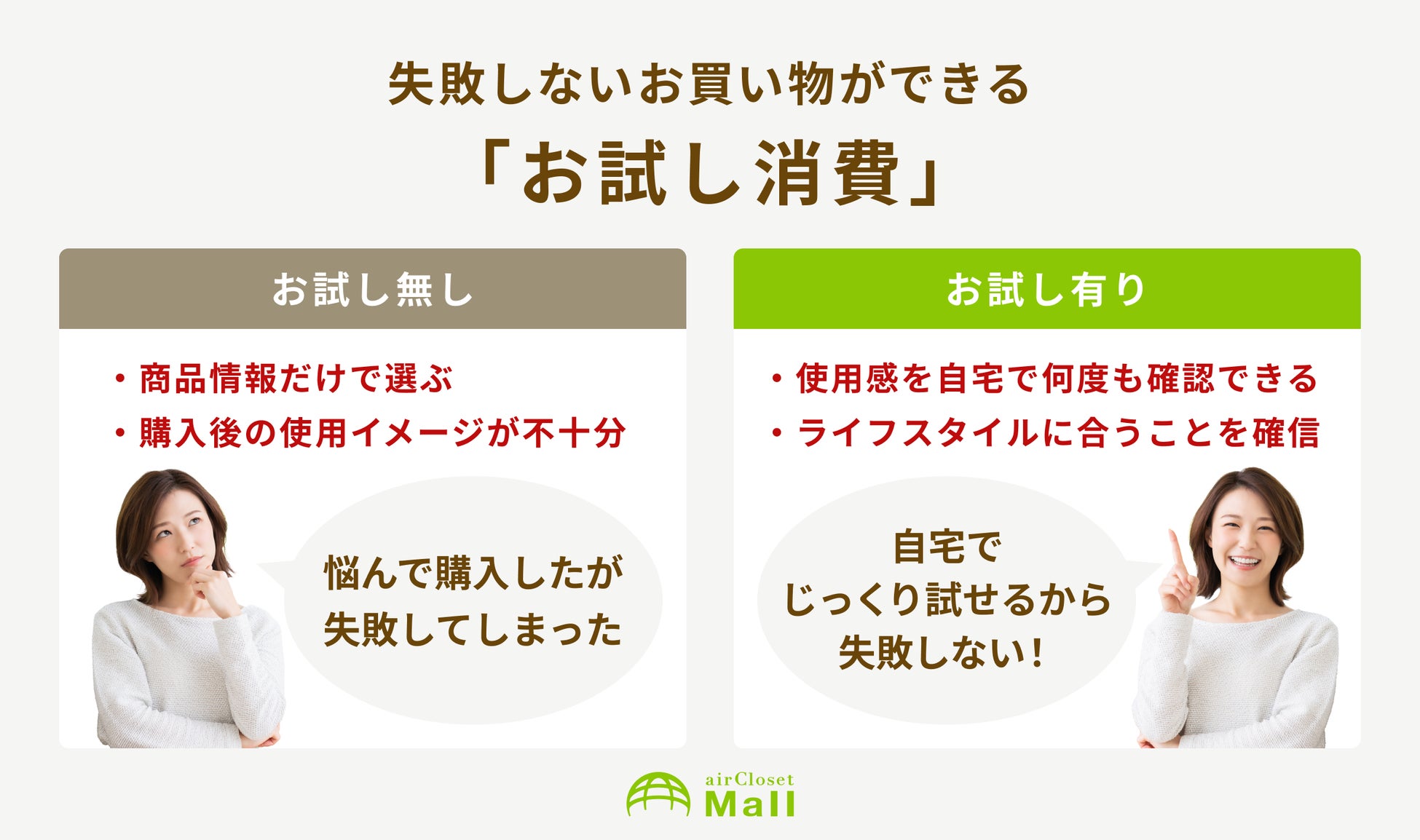 エアクロモールは、サービス開始当初より、気になる商品をレンタルで試してから購入する「お試し消費」の体験を提供しています。また、当社はビジョンとして「時間価値」の向上を追求しているため、エアクロモールを通じて、購入前に長い間悩んだり、悩んだ結果購入し失敗してしまったという体験を減らしていきたいと考えています。現在は、一都三県を中心に30~50代の男女に、失敗しないお買い物ができるサービスとして楽しまれています。