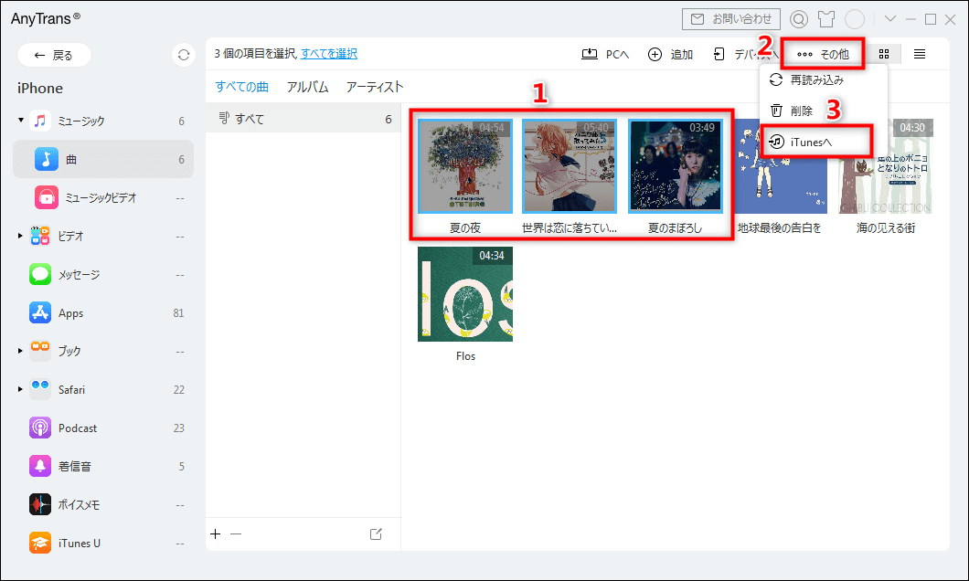 Step 3.iTunesへ転送したい曲を選択して、「iTunesへ転送」ボタンをクリックしてください。