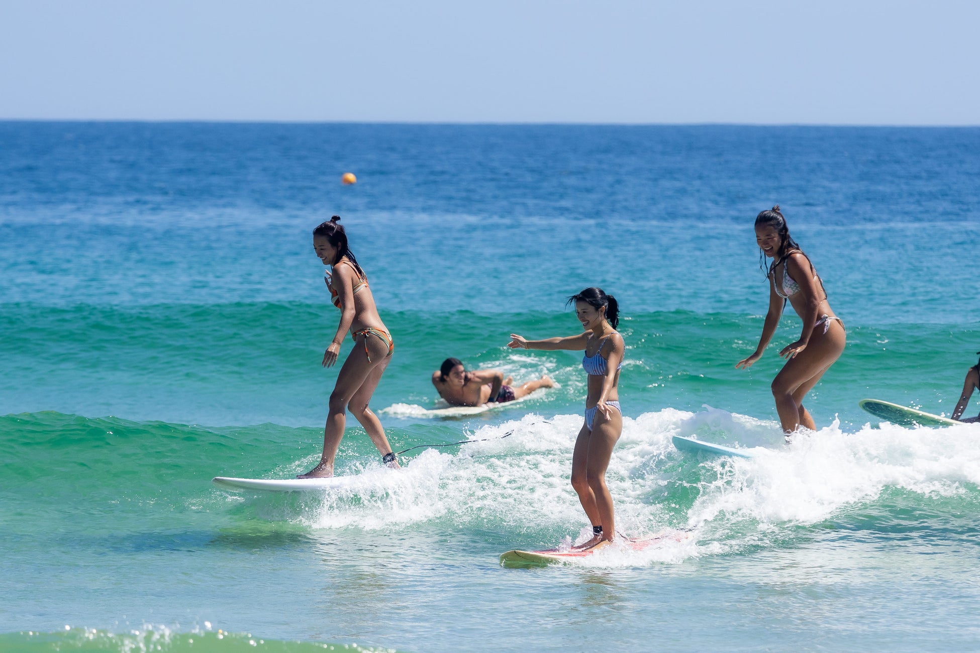 青い空の下、透き通った美しい海でサーフィン。