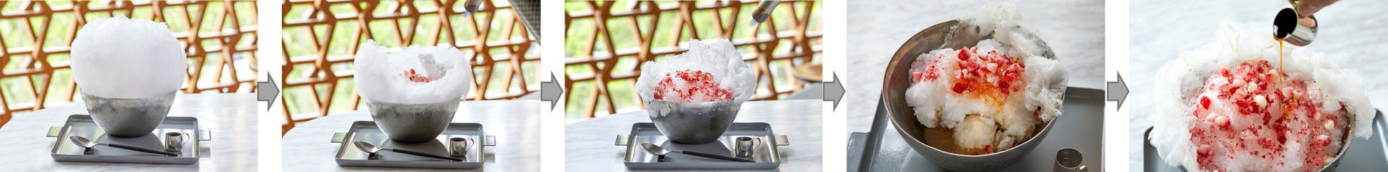 カカオパルプを搾った果汁のアイスクリームソースを敷き入れ、その上にたっぷりの天然氷と、ダイスとパウダー状にした苺を乗せ、ミルク味の綿あめをかぶせた、まっしろなかき氷です。お客様の目の前で炙り、いちごミルク飴のような食感を持つ、いちごミルクソースをつくりあげ召し上がっていただきます。