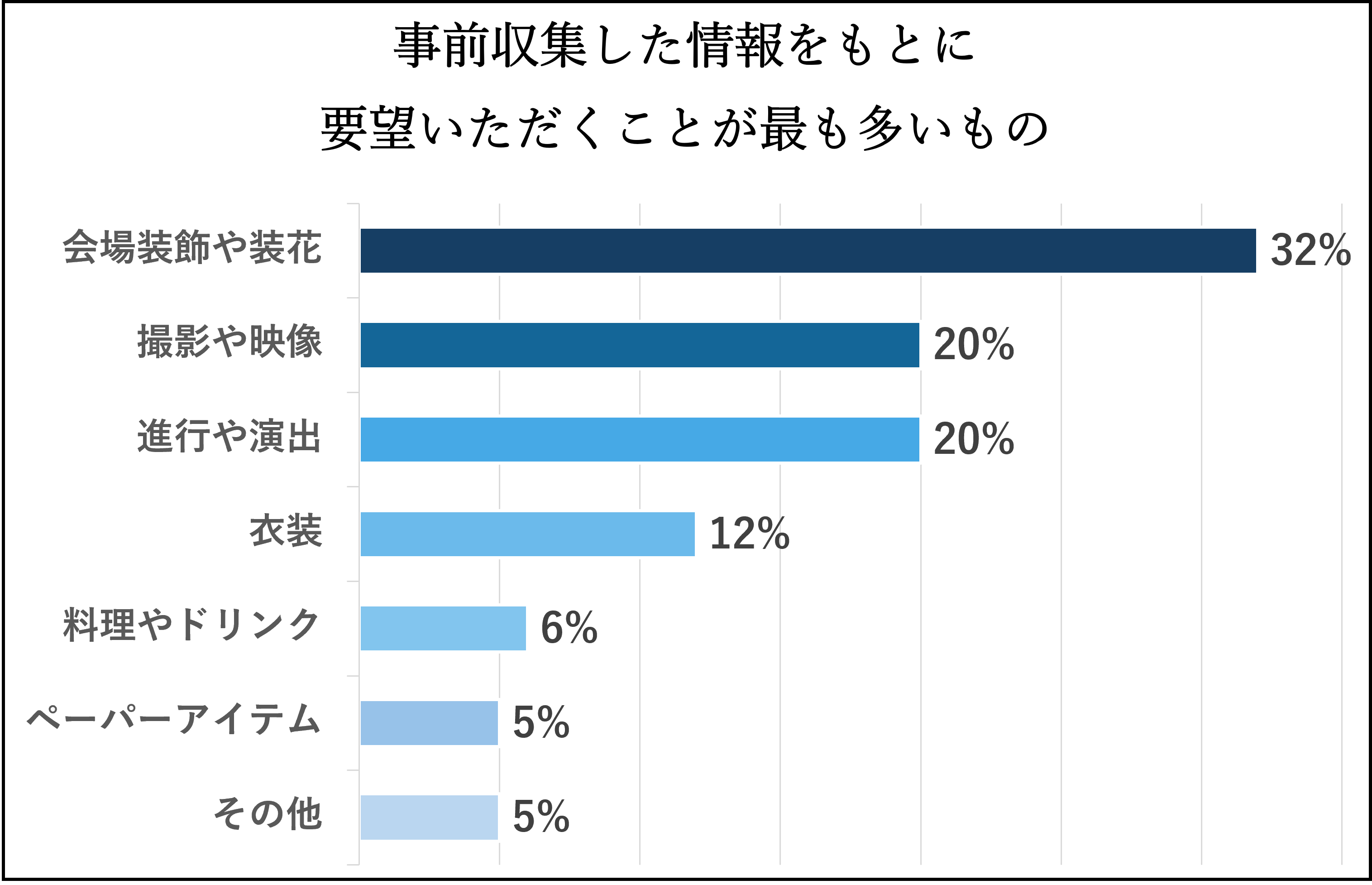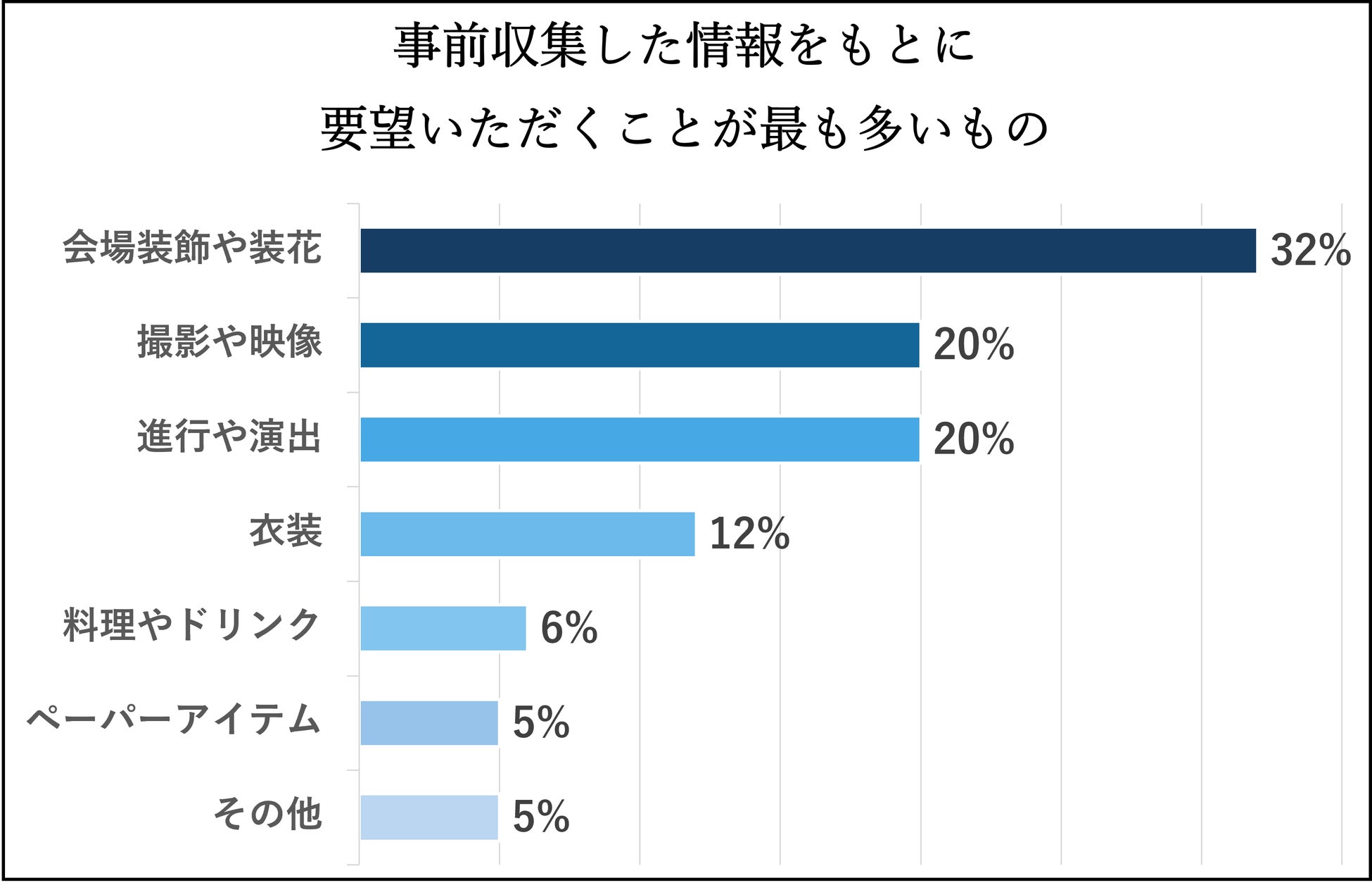 お客様からの要望で最も多いのは「会場装飾や装花(32%)」、次いで「撮影や映像(20%)」「進行や演出(20%)」、「衣装(12%)」という結果に。列席経験や挙式済みカップルのSNS投稿などを参考に、実際の会場デコレーションや使用アイテム、進行などについて幅広く情報を収集し、結婚式の参考にするカップルが多いことが分かりました。