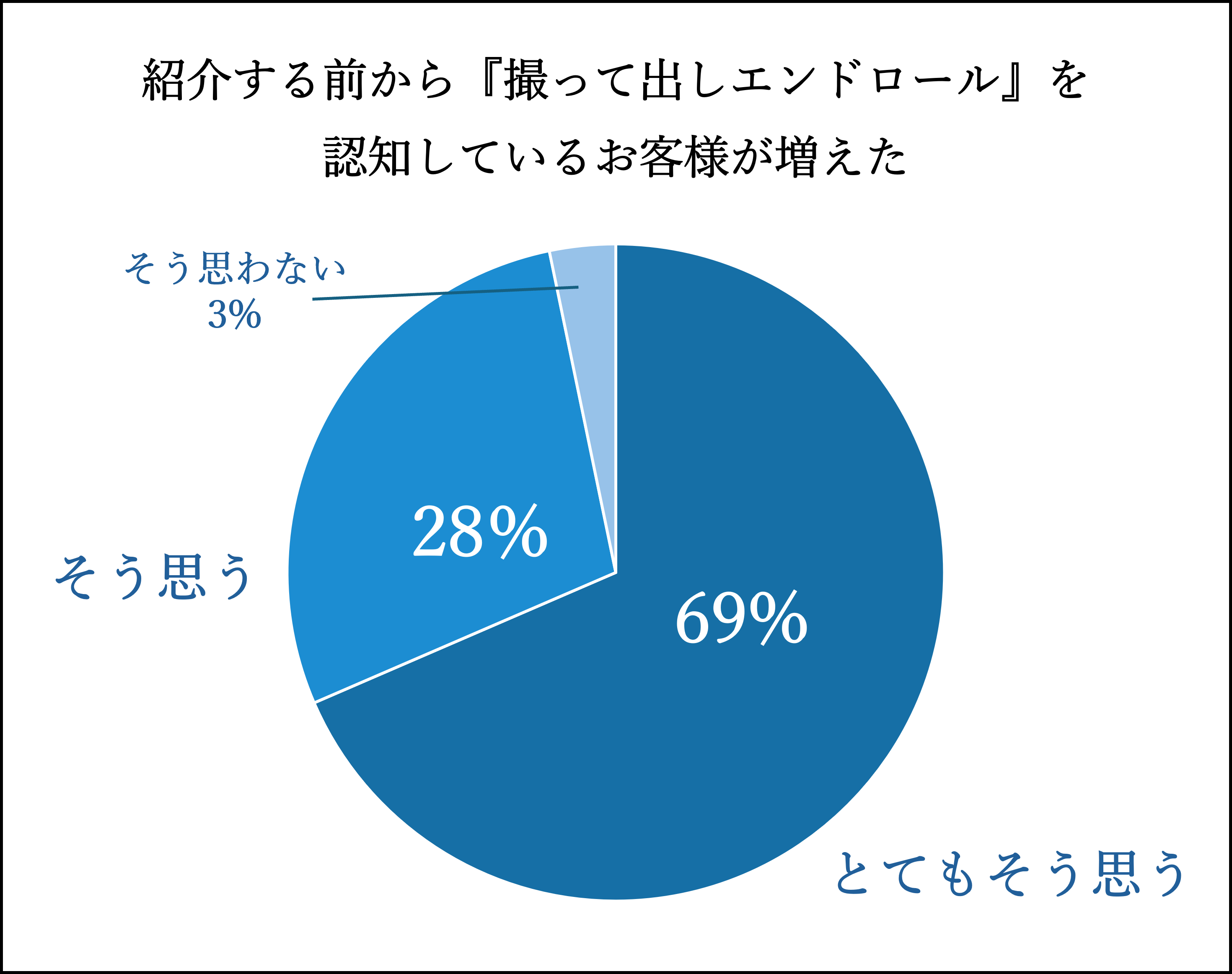 SNSにおいて動画の重要性が高まる中、結婚式でも同じトレンドが見られます。当社が提供する『撮って出しエンドロール』について、「紹介する前から存在を認知しているお客様が増えたか」という質問に対し、「とてもそう思う」「そう思う」の回答は97%に上りました。