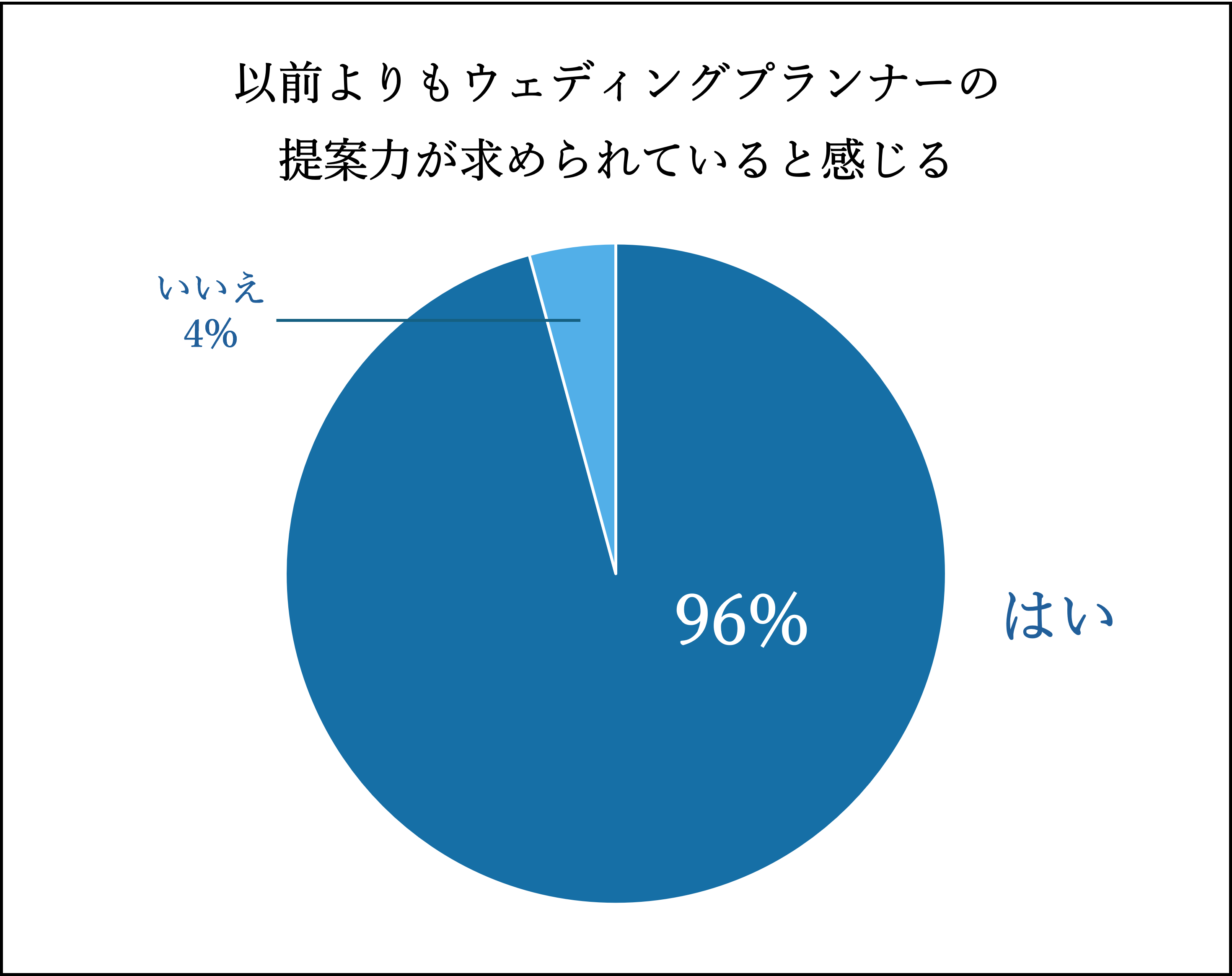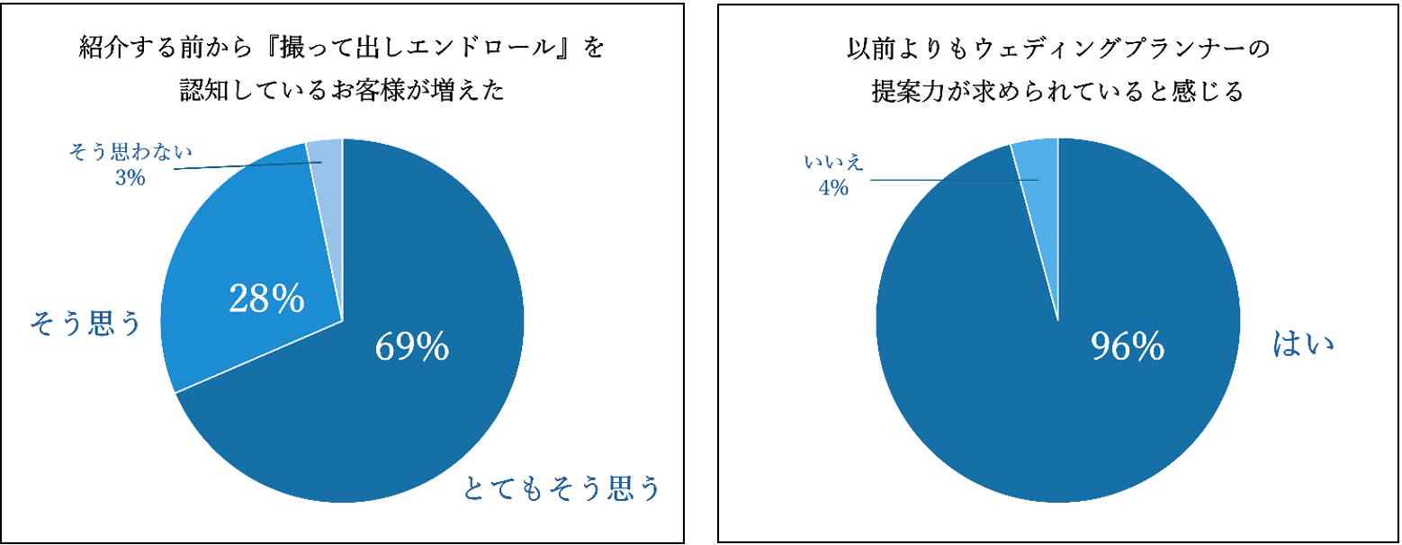 この商品を認知する主なきっかけは列席経験とSNSで、数多くの撮って出しエンドロールを見たり調べたりできるからこそ、憧れが強い方やオリジナリティを求める方も多く、96%のウェディングプランナーがエンドロール制作において以前よりも提案力が求められていると感じています。