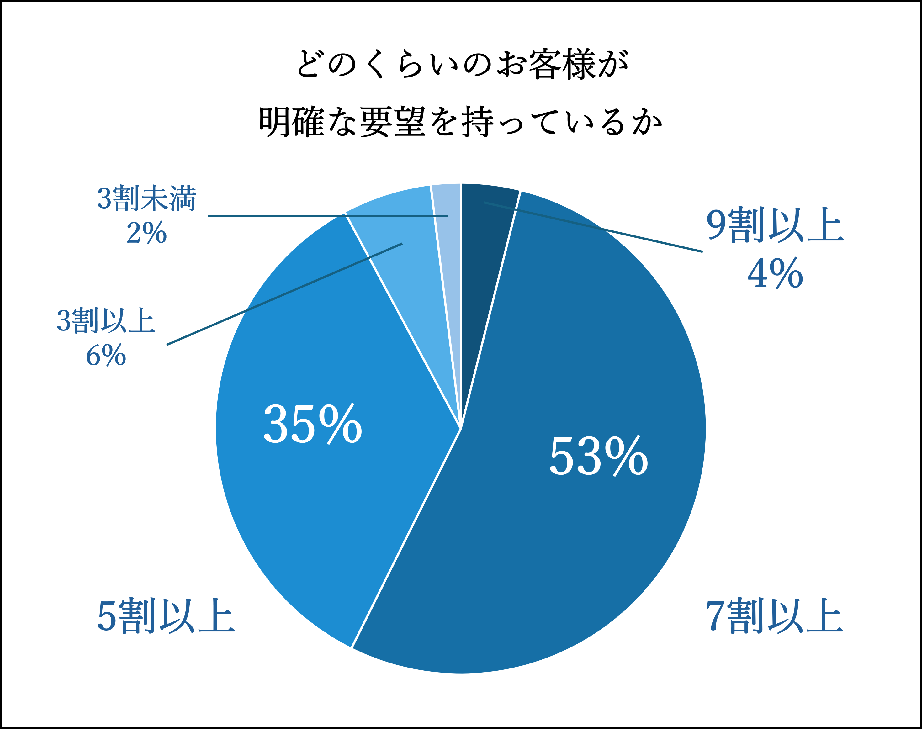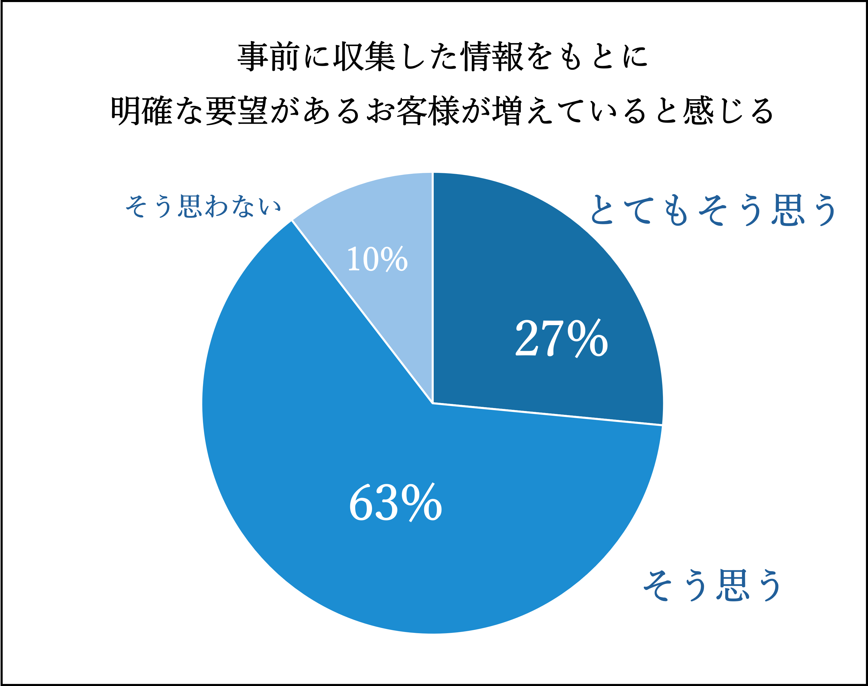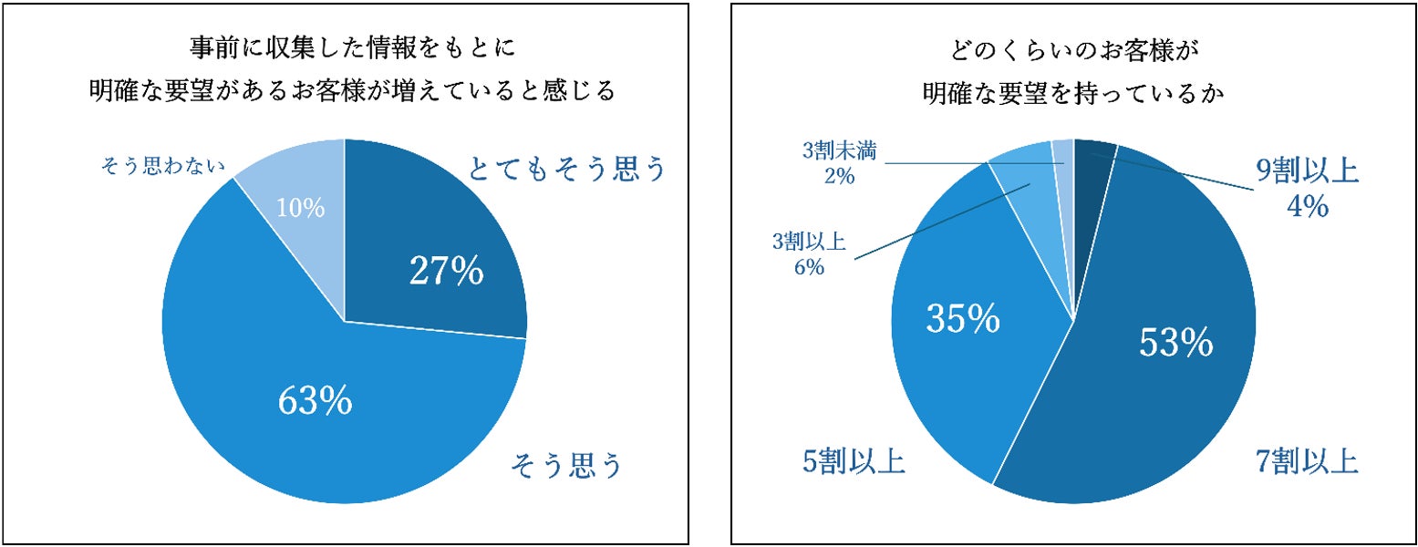2020年4月以降と以前を比較し、「事前に収集した情報をもとに演出やビジュアルイメージなどの明確な要望があるお客様が増えていると感じるか」という質問に、約90%のウェディングプランナーが「とてもそう思う」「そう思う」と回答。また、90%を超えるウェディングプランナーが「半数以上のお客様が明確な要望を持っている」と答えました。
