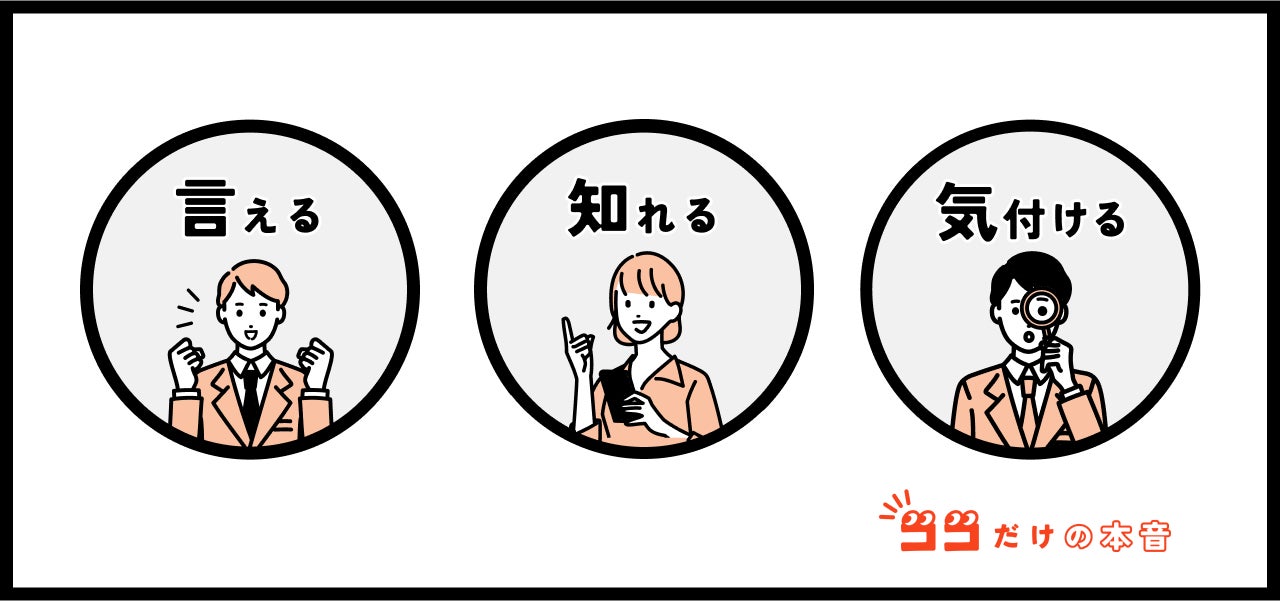 『ココだけの本音』は、ココ(個々)人が、はたらくに関する本音を「共有できる場」をココ(JobQ Town)に作りたい、という想いから誕生しました。