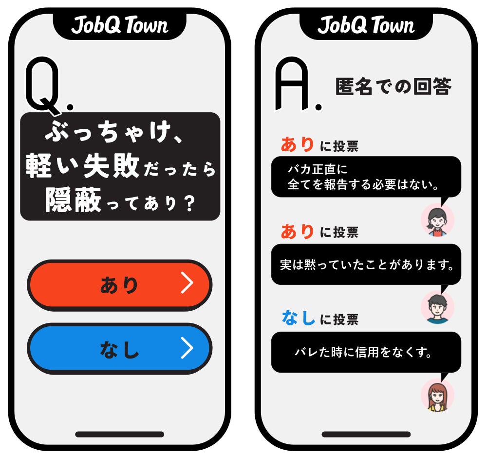 『ココだけの本音』は、運営側が日常の”はたらく”に関する問いを投げかけ、ユーザーに”匿名”、且つ”本音”で回答をしてもらう仕組みです。最近では「軽い失敗だったら隠ぺいってあり?」の問いに対して「バカ正直に全てを報告する必要はない」や「実は黙っていたことがある」など、”あり派”の意見や「バレた時に信用を無くす」などの