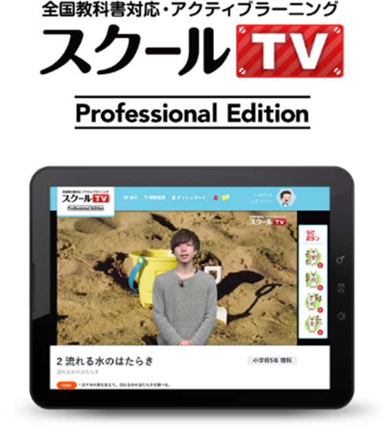 学習塾・学校などを対象とした『スクールTVプロフェッショナルエディション』は全国の主要科目の教科書内容を網羅した小中学生向けの動画教育サービスです。約1,000本の授業動画を配信し、自ら能動的に学習する「アクティブ・ラーニング」のメソッドを日本で初めて動画内に導入しています。授業動画を視聴中に、動画に連動した問題が出題されるインタラクティブなドリルを提供することにより、勉強が苦手な子どもたちでも飽きずに授業動画を視聴できるように設計されています。