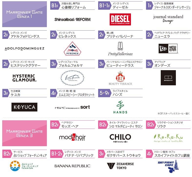 マロニエゲート銀座1 B1F~9F全店舗(3Fスターバックスコーヒー除く)