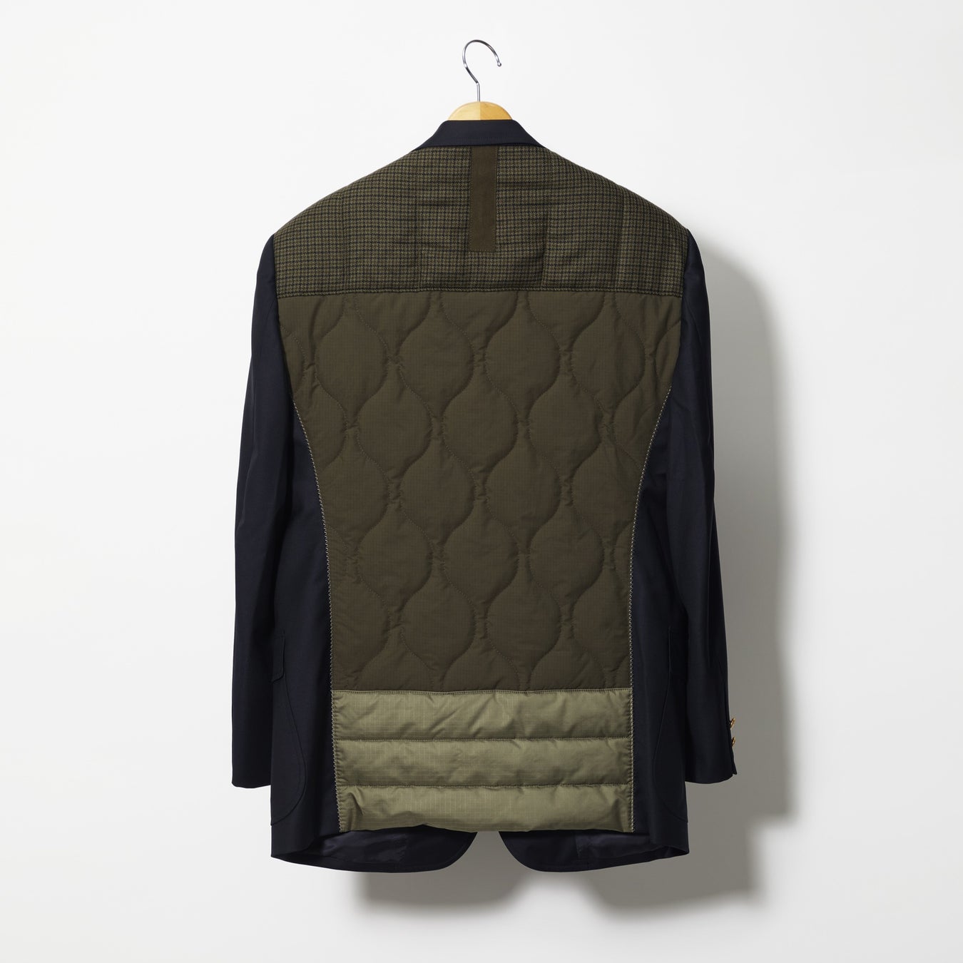 eYe JUNYA WATANABE MANのブレザーは、ブルックス ブラザーズの定番であるトラディショナルサックモデルをそのままに、後ろ身頃を一度解体して背ヨークにブラウンベースのチェック、ボディにオニオンステッチ、裾にリップストップのキルティングで再構築しています。ブレザーにキルティングを融合させたデザインは、保温性も高く防寒にもぴったりです。
