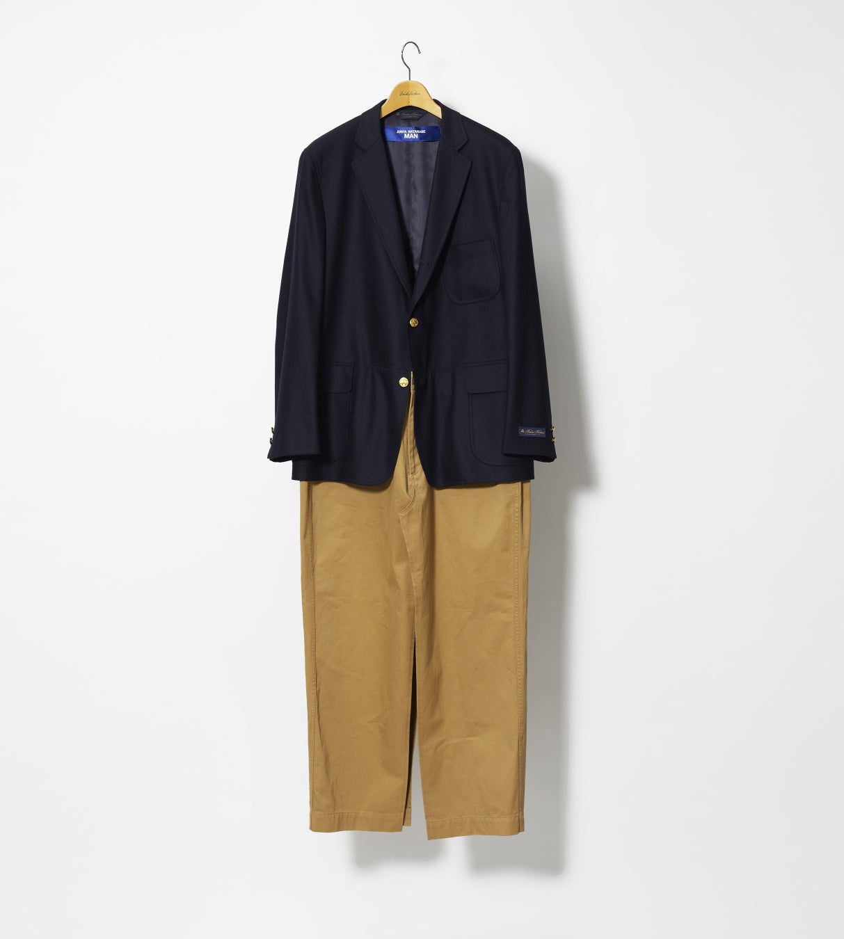 ブルックス ブラザーズの原点とも言える3釦段返りのトラディショナルフィットのブレザーにベージュのチノというアメトラスタイルを一枚のコートで表現しています。ジャケットとボトムを組み合わせるという斬新な提案のコートは、「reconstructed suiting/スーツの再構築」をテーマに掲げたJUNYA WATANABE MAN 2024年秋冬メンズコレクションに登場したモデルです。